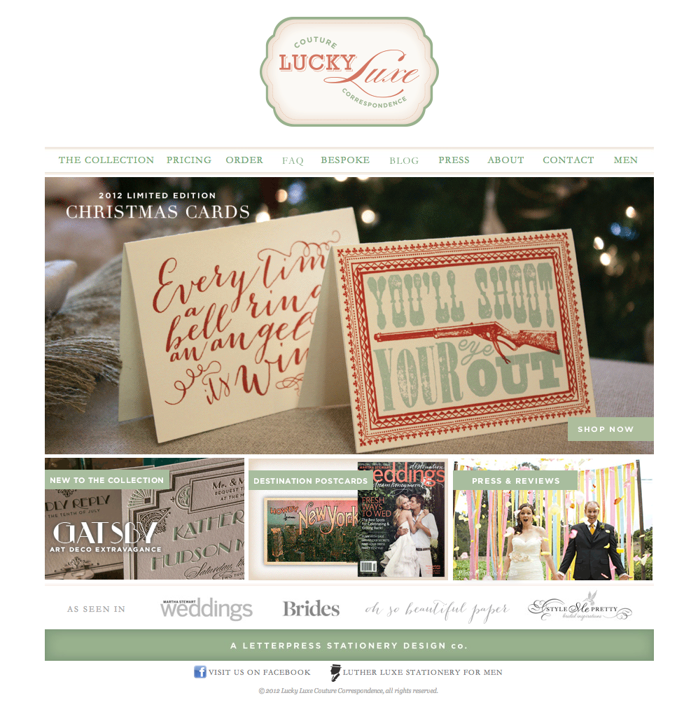 And the 2012 Lucky Luxe Christmas card collection is now available, so you need to hurry and check that out. One design is called Bedford Falls, and the other is called Ralphie. You can guess their inspiration: