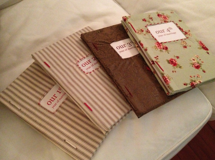 Tonight after a huge dinner, Ben gave me our 4th Year book. He’s been making one every year for our wedding anniversary since we were married, each one is bound in material relating to that year’s traditional wedding present. The 4th wedding anniversary gift is traditionally floral, and so: