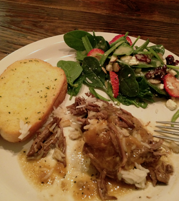 Even better, Ben’s mama and daddy came to see us tonight, bearing a roast with rice and gravy, spinach salad with feta, cranberries, strawberries and almonds. Ben made greens, and I just dragged myself in at 7:00 to put toast in the oven. And for a busy day like this, I think that was pretty good. I am beyond thankful for our loving parents that still take care of us big grown babies.