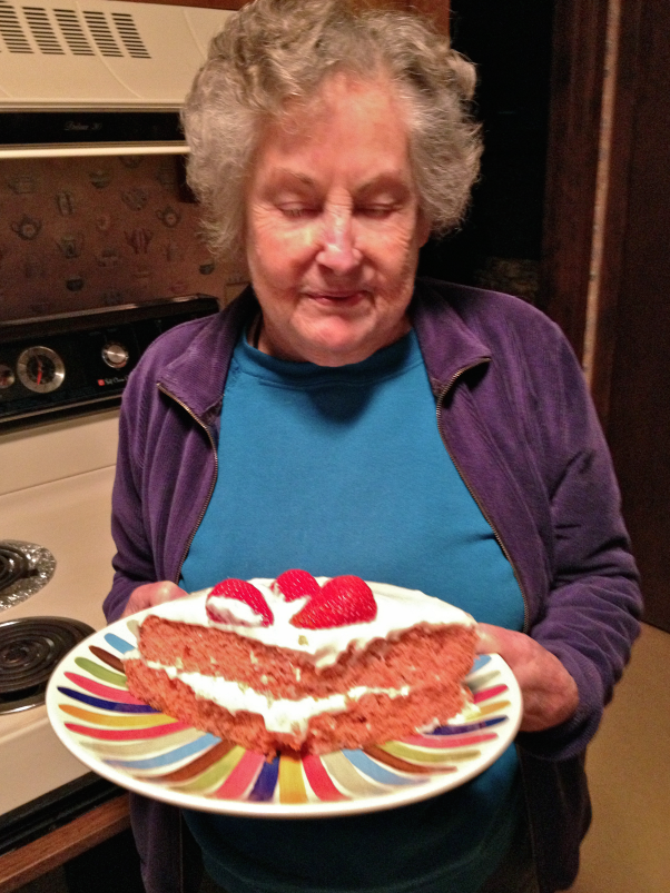 I went to the grocery store and bought some good looking strawberries (along with all my Easter lunch groceries—yikes) to make a strawberry cake for Mammaw’s early birthday surprise: