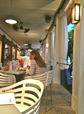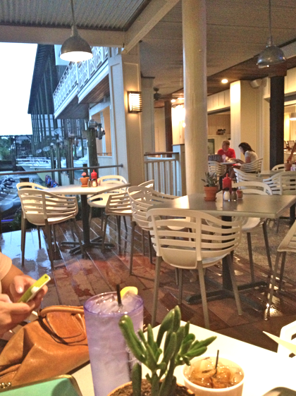 Fisher’s is wonderful because there are no walls, just open garage doors with the marina all around, cool air, breezy white linen curtains and linen and wicker sofas and lounge chairs for hanging out, and really good food. It feels really refreshing, bright, airy, bubbly and comfortable. Like if Sprite were a restaurant. Or like a cold shower on a hot day. If you can understand what I mean by that.