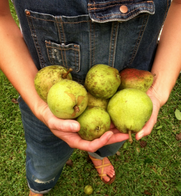 This morning while I was making Ben’s coffee I realized that our pear tree was so heavy with fruit that the branches were near breaking and touching the ground. I always thought pears weren’t ripe until closer to autumn since that’s when it seems mama always makes her famous pear cake with caramel icing, but I guess I was confused. After lunch I took off my church clothes and grabbed a bucket thinking that would be plenty to carry our harvest out to my parents’ house so she could teach me how to make preserves.