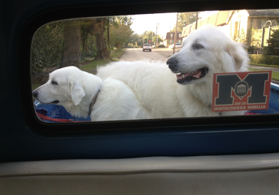 My two favorite dogs went to the vet with ear problems this morning and came home groomed and doctored up. Chevy jumped up into the truck for the first time without being forced—almost like he enjoys riding… But he still hated it. Here, see the two-headed dog: