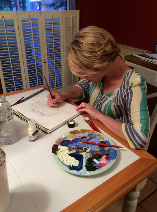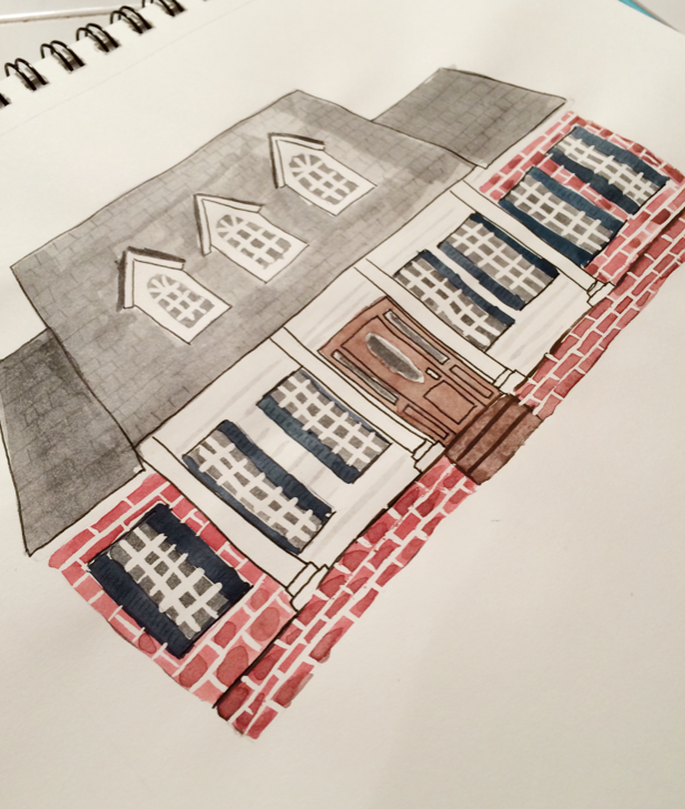 I’ve never considered myself to be much of an illustrator. I always feel like I should make a disclaimer about that as well as the fact that I am not crafty—it seems like I should be, but no. I don’t do much with my hands. But a lot of people have complimented the quirky and grossly inaccurate watercolor I made of our house that hangs in our dining room and when I was at mama’s house the other day I had an idea. A friend of hers had sent a thank you note that had a realistic charcoal drawing of her house and their address on the front of the card. They live in a beautiful mediterranean on 6th Avenue. And I thought “Hey! I’d like some notecards with our house and address on em. I could do that with that janky watercolor I did way back.” And now… I think I’m going to offer off-kilter house portraits in our shop in a few days! My mama is my first guinea pig, so I started an illustration of the house I grew up in tonight.