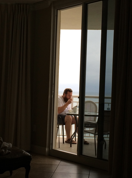 We woke up to a cloudy, dreary day at the beach. Which didn’t stop Ben from having his breakfast out on the balcony, DANGIT.