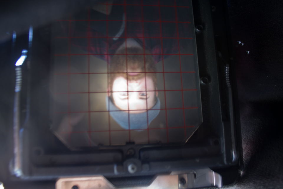 He puts a thin, small piece of sheet metal in a chemical bath for a few minutes and when the time is right, he rushes out of the dark room with it and puts it inside the camera. He covers his head with the black cloak to see the subject on the viewfinder (upside down), gets it perfectly in focus, then either snaps an instant photo with the flash… Or you have to be completely, perfectly still for 3 seconds while the lens captures the image without a flash.