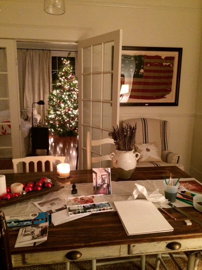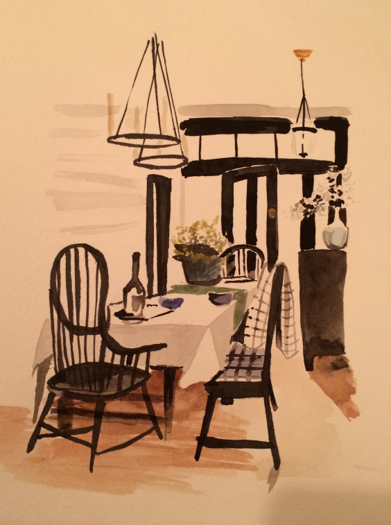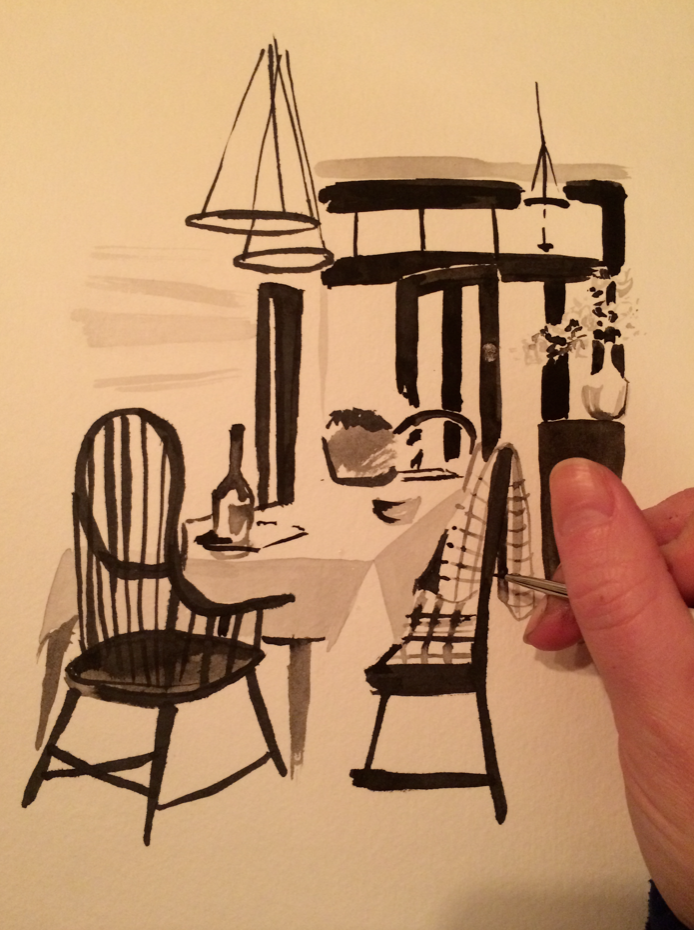 So our main squeeze at the network watched the sizzle this morning and then called to tell us that… She loved it. And other terrifyingly encouraging, exciting things. I was shaking a bit when I hung up and relayed the information to Ben. It all feels very much like a dream. One thing she did ask is if I could create paintings of the way I envision the interiors just the same as I do the exterior portraits, then they can edit the sizzle and include these illustrations. And I haven’t drawn a room since 7th grade for Mrs. White when she asked us to pick a room from a magazine and use perspective lines projecting out from the horizon line. So. Here is my first effort at painting one of the rooms she and I chose from my inspiration Pinterest board in very very dim light at my dinner table: