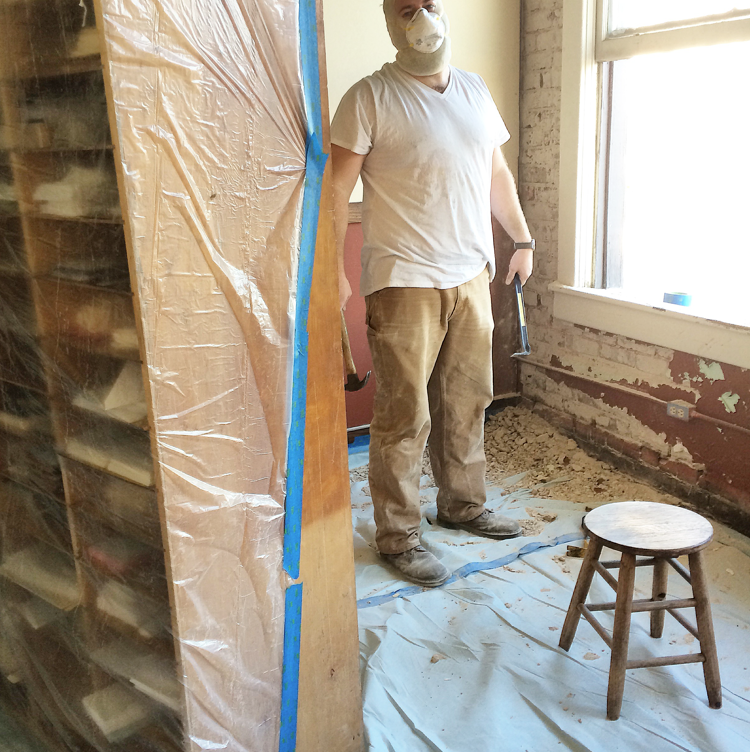 Got the floors and sample cabinets tarped up and Ben knocked all the plaster off his office’s wall to expose the brick: