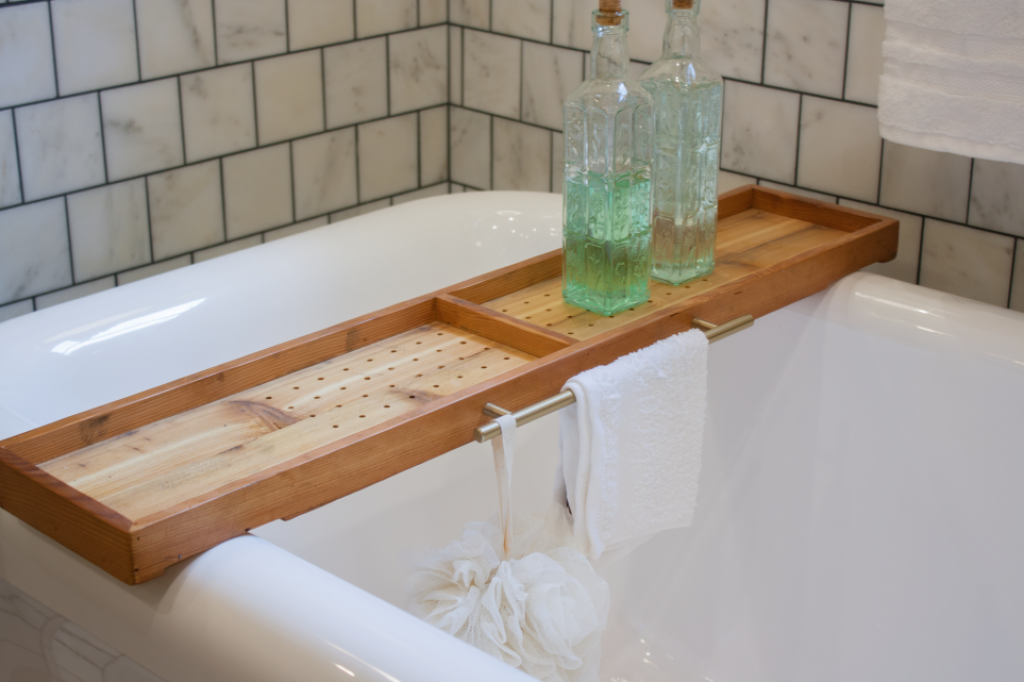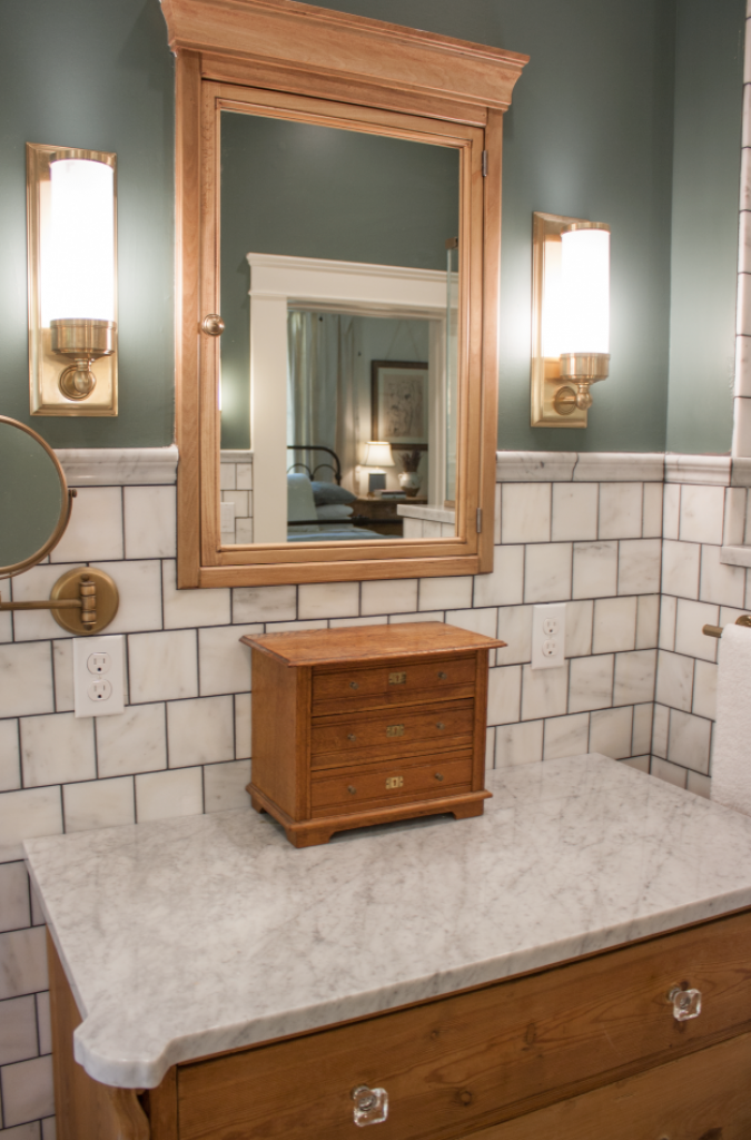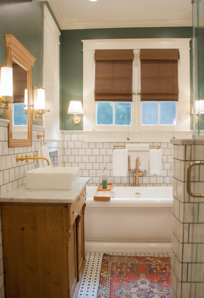 We used 4×4 carrara marble tile for the walls and floor edge, carrara marble chair rail at 5 feet running the span of the room beneath the window, black pencil tile to create the border frame, then a carrara and black mosaic tile we got for a steal at a salvage dealer. We added custom inset maple medicine cabinets, brushed brass sconces, a load-bearing ceiling beam wrapped in millwork that is the joint of the old / new structure, and had cabinet doors flanking the bathtub niche made by Morgan Brothers to match the rest of the 1920s doors in our home. The tight space meant pocket doors were the only way we could make it work. We modified the original swing door into a pocket, then found a petite one that just happened to match for $50 at a flea market to use for the toilet closet. Beautiful latches from our friends at House of Antique Hardware make them feel like they’ve always been that way. I love the tub caddy Ben built for my birthday from reclaimed cedar! After much debate we ultimately decided on Caldwell Green from Benjamin Moore’s historic color palette and I couldn’t love it more, the way it reads deep green, grey and blue depending on the light.