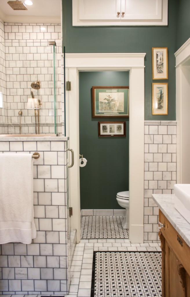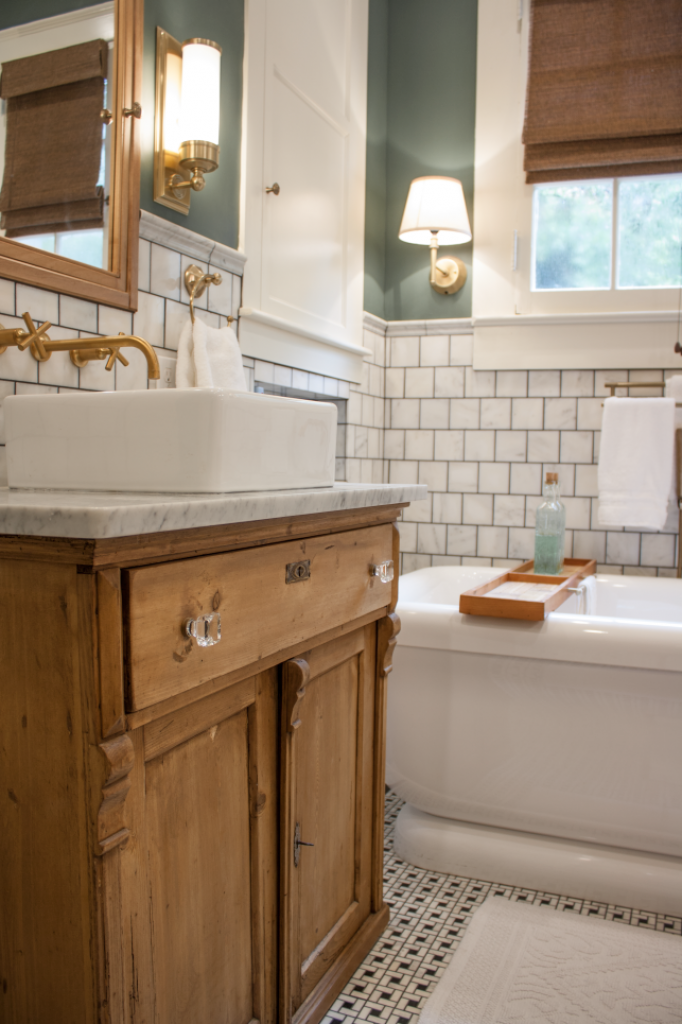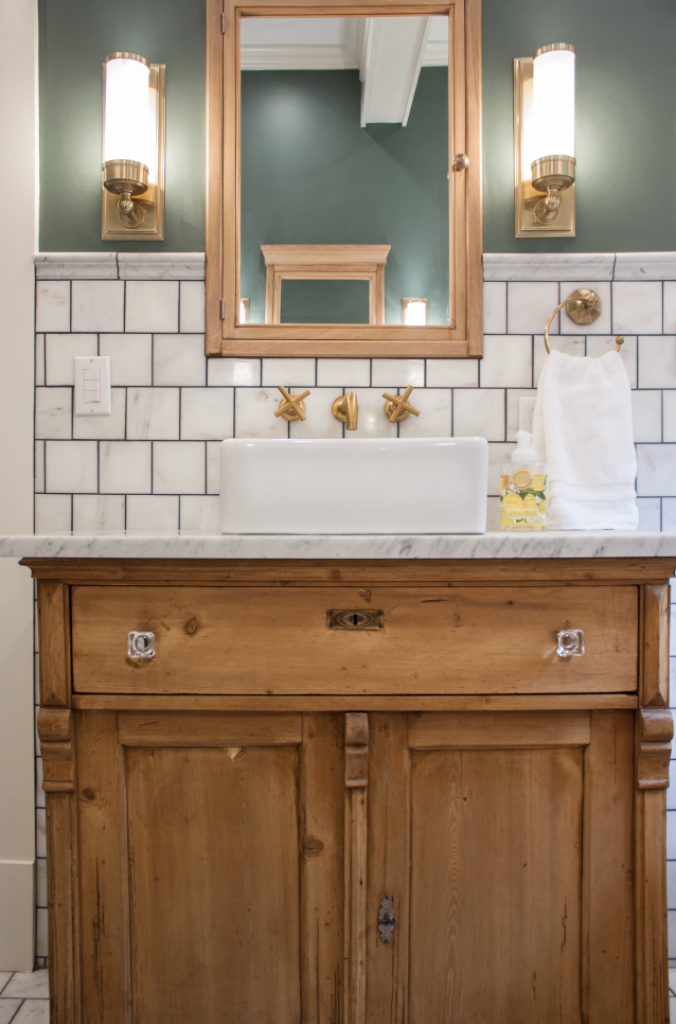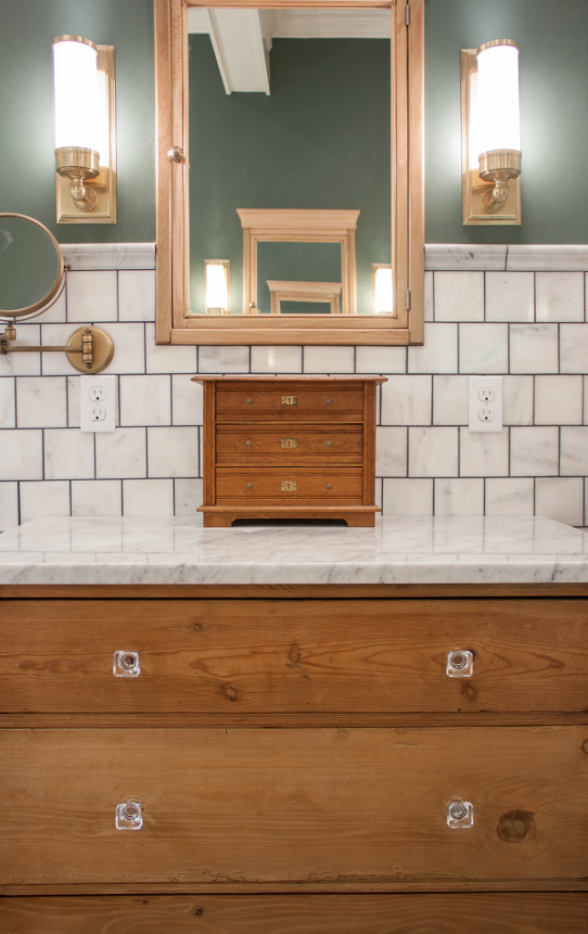 The vanities are antiques from Hungary that Ben modified to be counter height and work with plumbing, and the warmth and femininity they bring to the room balance all the cool black, white and green.