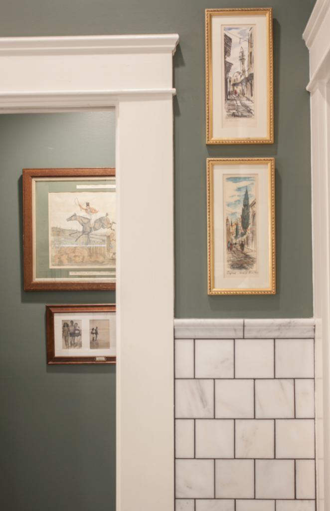 I found the little Italian charcoal and watercolor sketches for $25 at the Rusty Chandelier here in Laurel, the equestrian print at a European Antiques auction for $25, and the framed photos of my grandparents at the beach came along from the old bathroom.