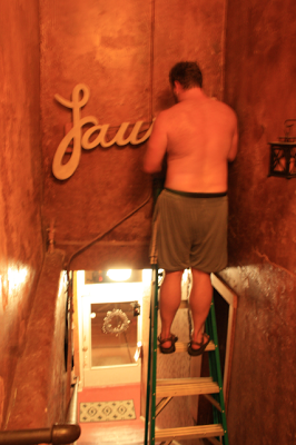 You have to understand. There’s no air conditioning in the stairwell. The boy gets HOT. Thank goodness for my Benny Boy who is always ready to climb on a ladder and hang a 30 pound metal sign at my whim. Our loft was once the Laurel Chamber of Commerce in the 1960s, and this was their signage. Isn’t it cool?