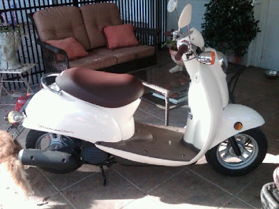 Our friends Mickey and Misty celebrated their wedding anniversary last week, and for a present he bought her a sweet little retro Vespa-looking scooter. After church we saw some people admiring it in the parking lot. I was scared, but I just had to ride it. Surprisingly, it was just as easy as balancing a bicycle, and the little seat with the platform for your feet made it easy to sit lady-like with my knees together. I felt so Euro.