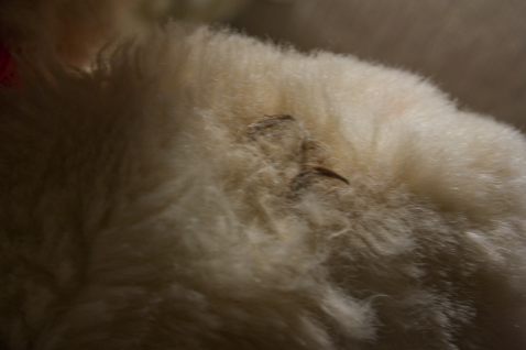 Choco came with a little white t-shirt with the Milky Way candy bar logo on the chest. In an effort to toughen him up, Ben took off his t-shirt, and tried to cut his fur into a little mohawk on top.