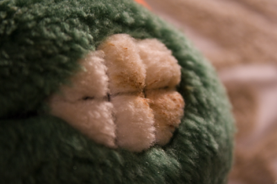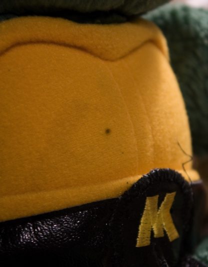 Choco’s left leg is longer because Ben would swing him by his leg to use him as a weapon against Tom and Sam. The stuffing is coming out a little at the seam, but otherwise he’s in good shape.