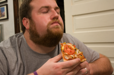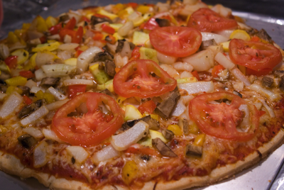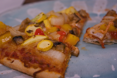 As you might already know, Ben gave up meat for lent so I’m trying to get creative and think of things I can cook that aren’t salad, green bean casserole or mac and cheese. We walked to the grocery store and picked up all of our favorites: red and yellow bell peppers, onions, mushrooms, squash, garlic and tomatoes, to create the ultimate vegetable pizza: