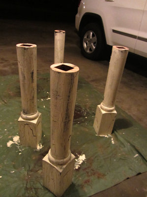In other news, because we’re buying a house which requires real furniture, table progress was made today. We got all the old columns cut down, the framing cut, and it’s all painted and drying now: