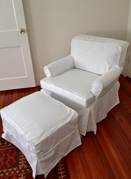In one of my riskiest money-saving maneuvers ever, I went through a website called Needle & Shears to order custom made white denim slipcovers that would match the new sofas from Ikea. Mama’s old couch, the most comfortable one in the universe, is roughly the size of a boat and sleeps better than the most expensive bed in the world. But it was covered in a tan corduroy that incidentally matched exactly the armchair and ottoman we bought with the house from Mrs. Mary Lynn. Which is okay, but I’m all about white, you know.