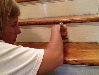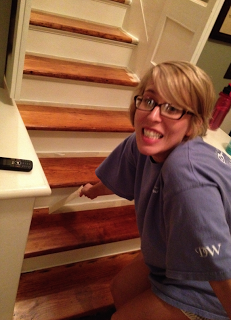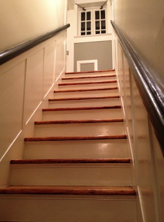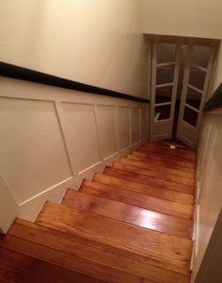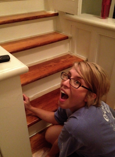 I basically skipped out on working all day today because I was so excited to get started on finishing the stairs since the treads were completely finished yesterday. It’s the sort of small work that I could do alone and since Ben was prayer luncheoning and getting ready for youth sabbath, from 10 am to 6 pm, I filled nail holes and taped and caulked and primed and painted until my back feels broken.