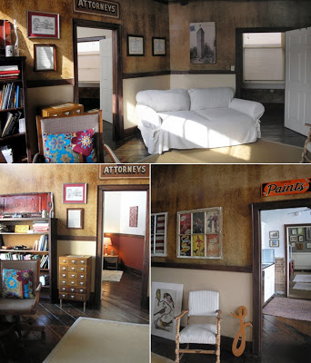 (Recognize my new card catalog? It was a gift from a local pharmacist! Ben reupholstered that wooden ticking stripe chair. It belonged to his grandparents. The walls were done by the law office that was here in the early 90s — It’s stain on plaster.)