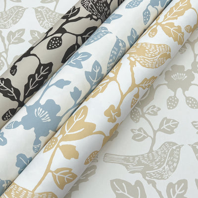 Songbirds-in-silhouette perch among flowering stems and leaves in the heirloom-inspired pattern Sparrow & Oak.