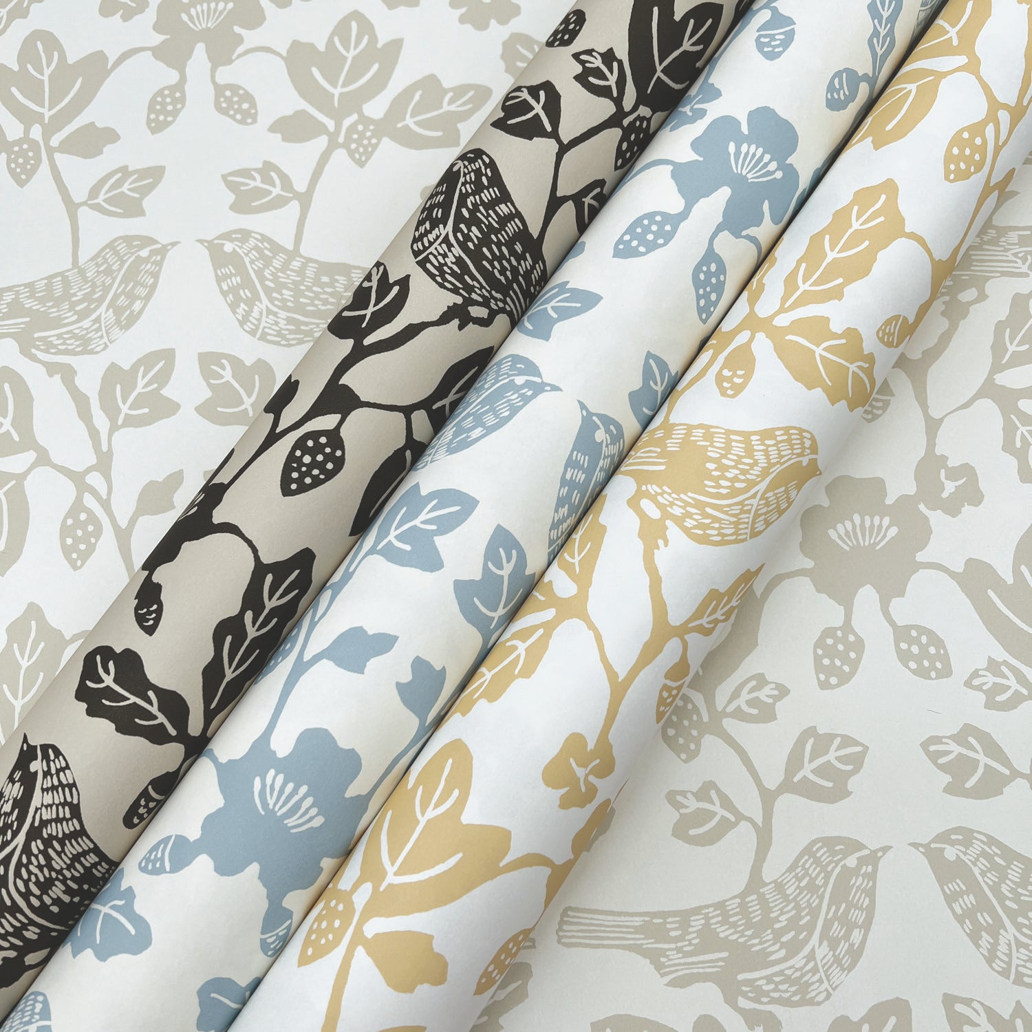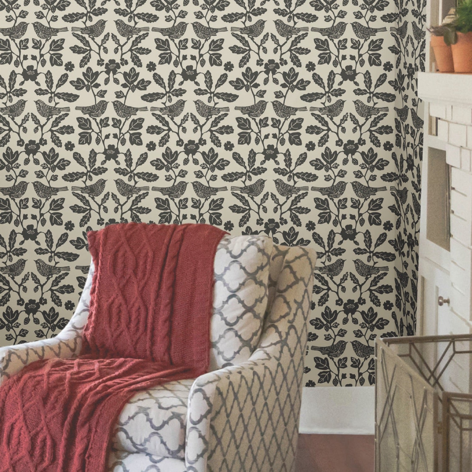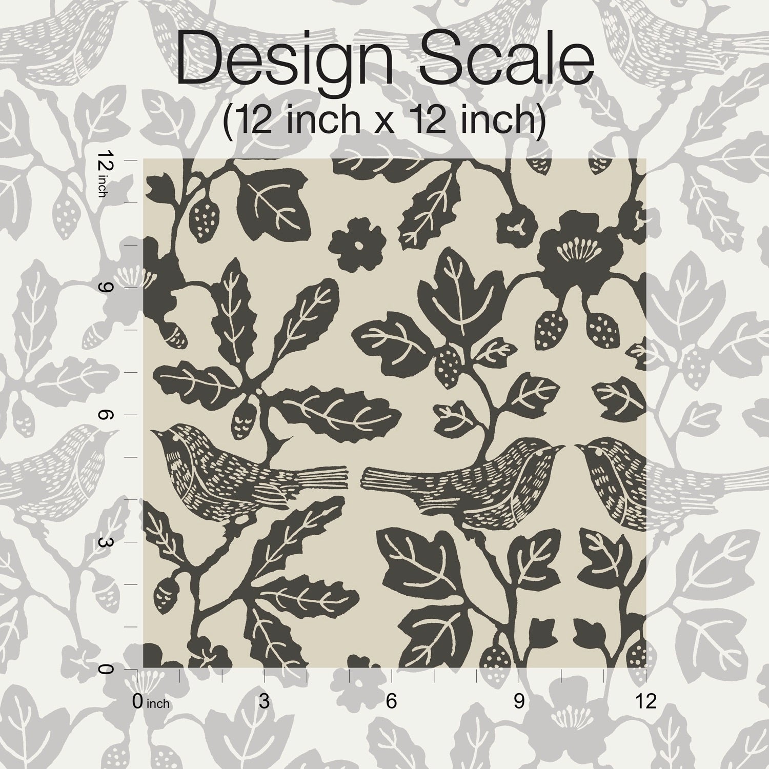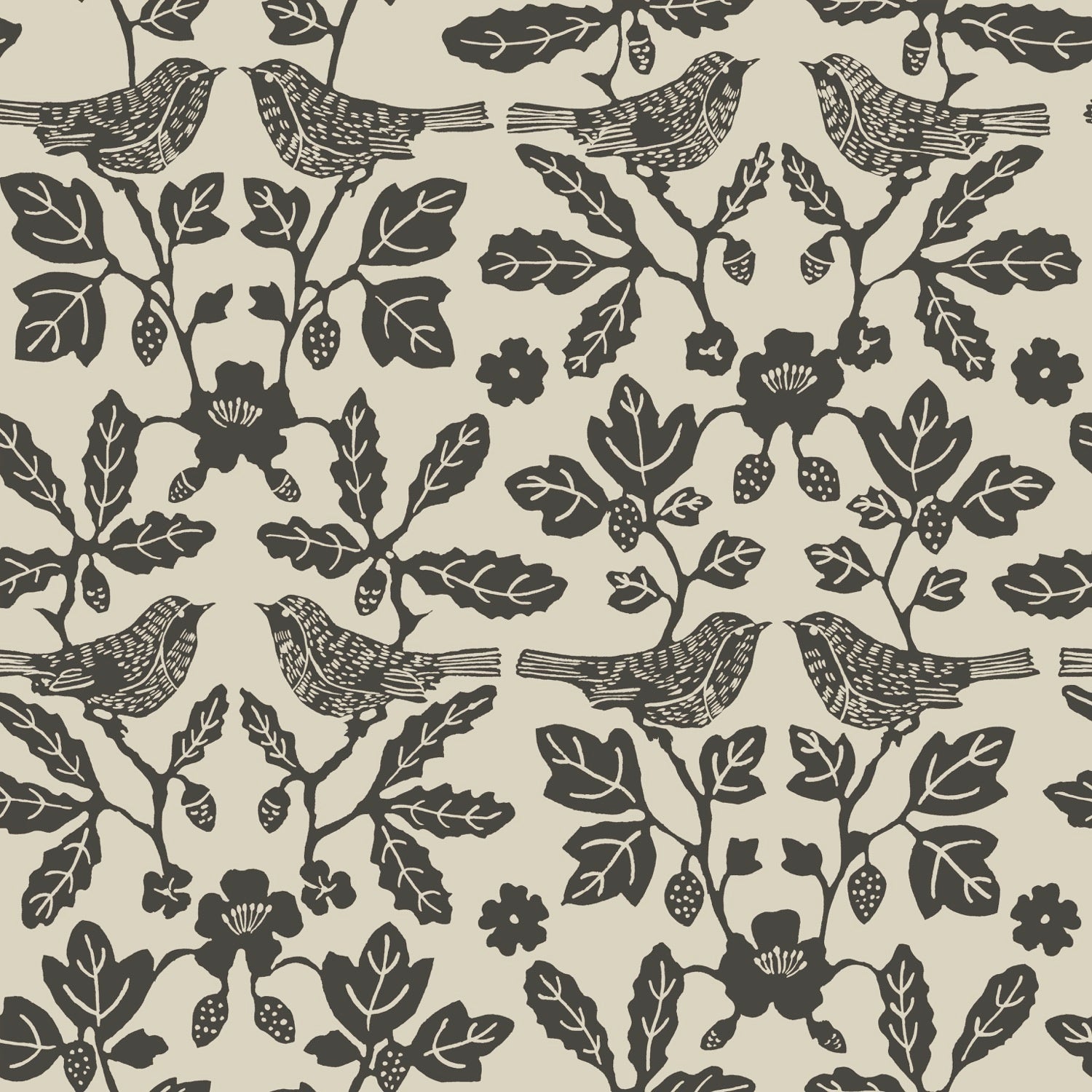 Songbirds-in-silhouette perch among flowering stems and leaves in the heirloom-inspired pattern Sparrow & Oak.