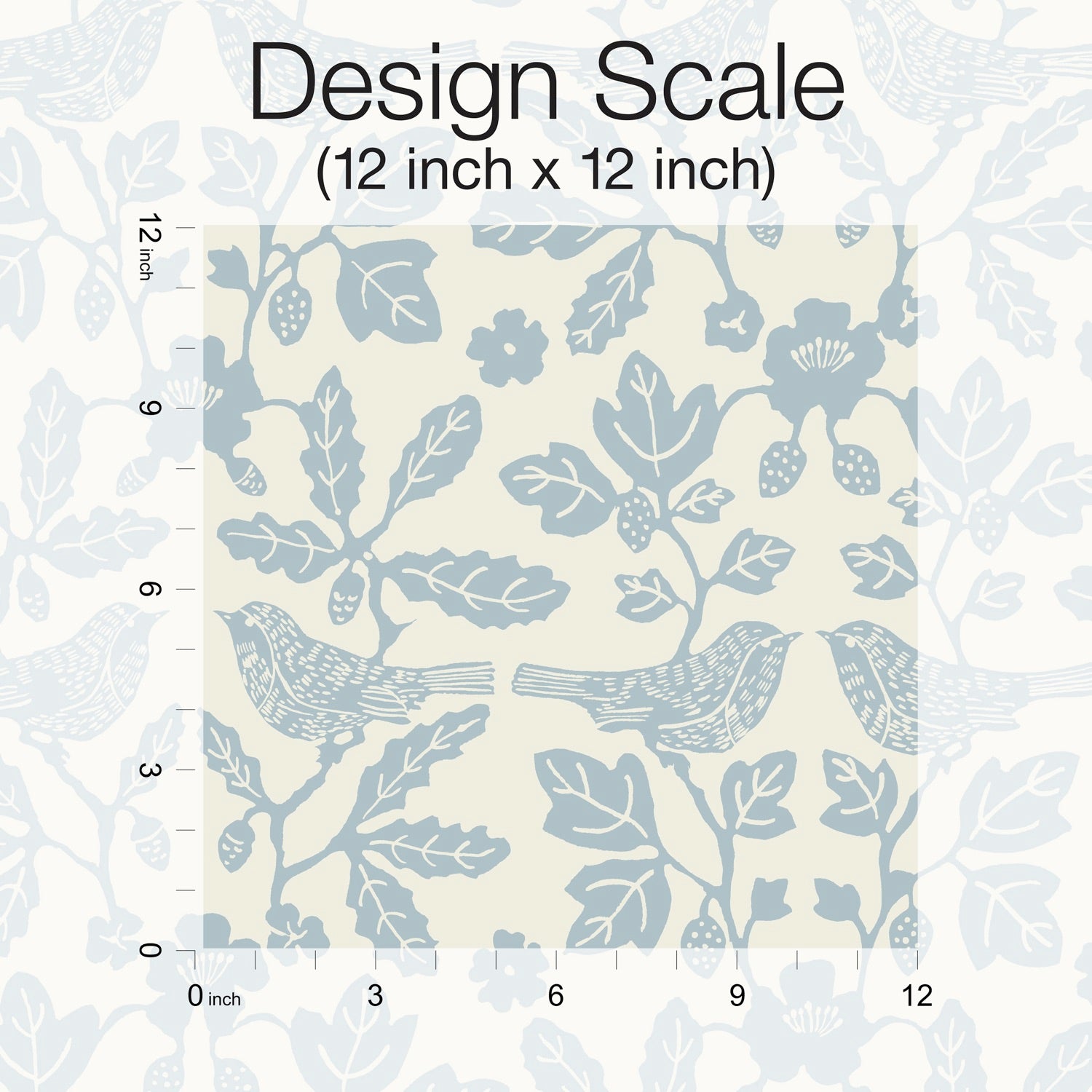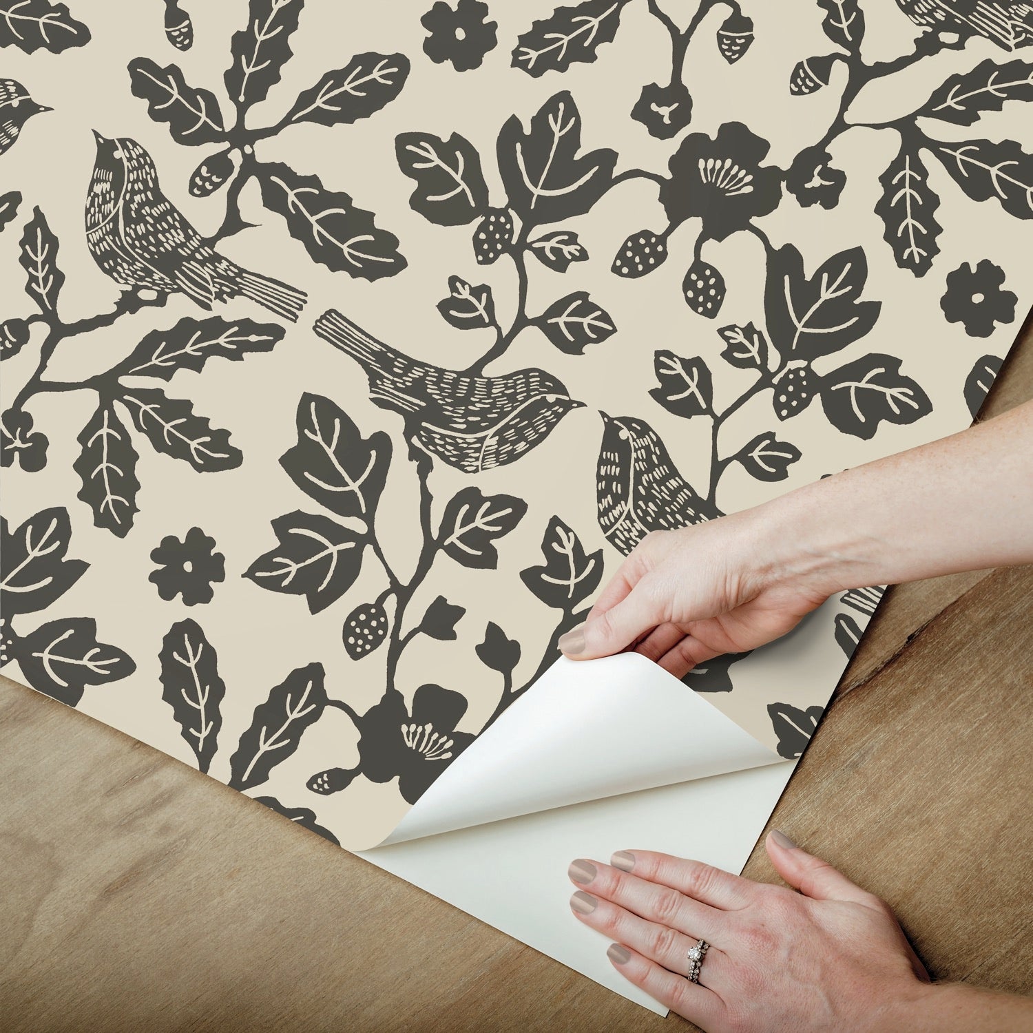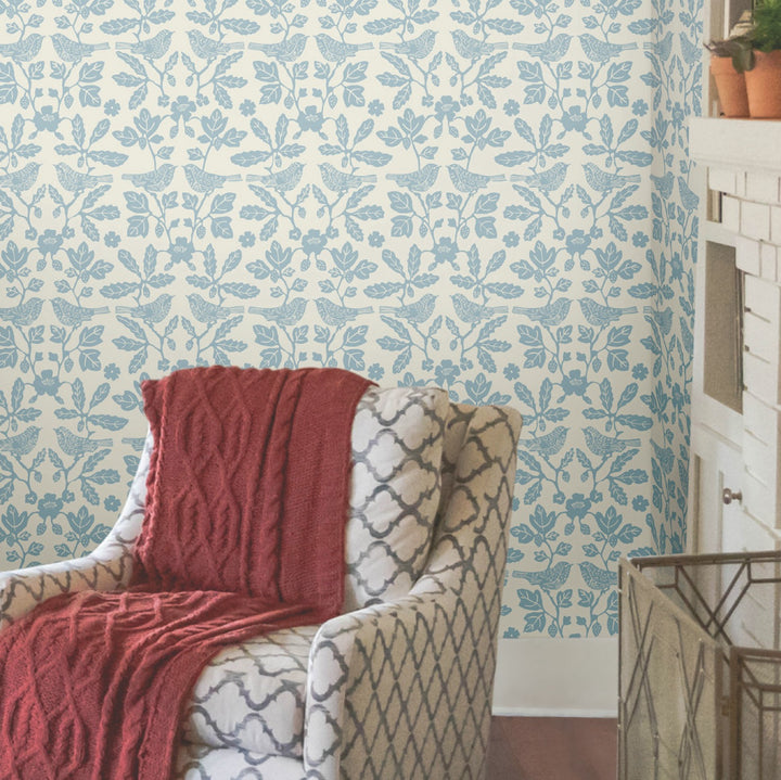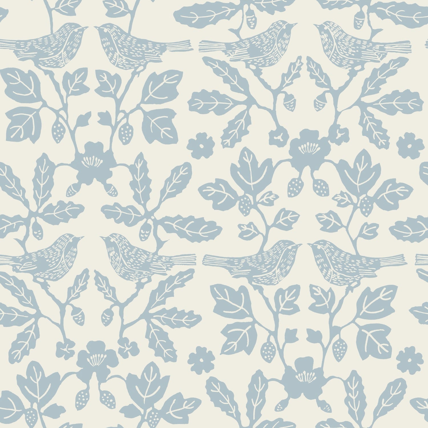 Songbirds-in-silhouette perch among flowering stems and leaves in the heirloom-inspired pattern Sparrow & Oak.