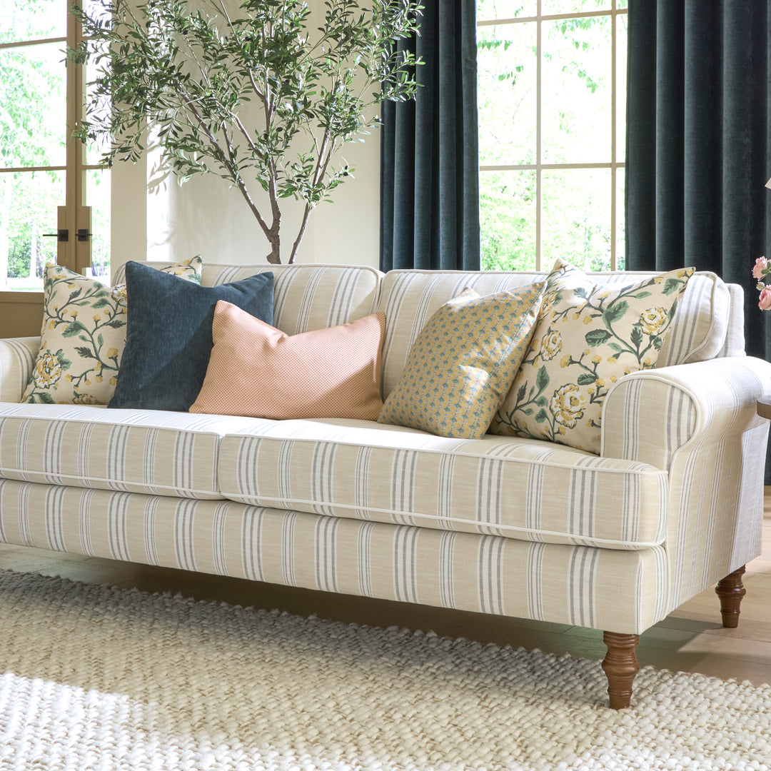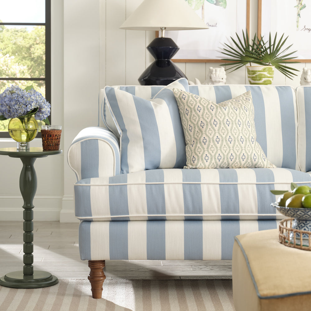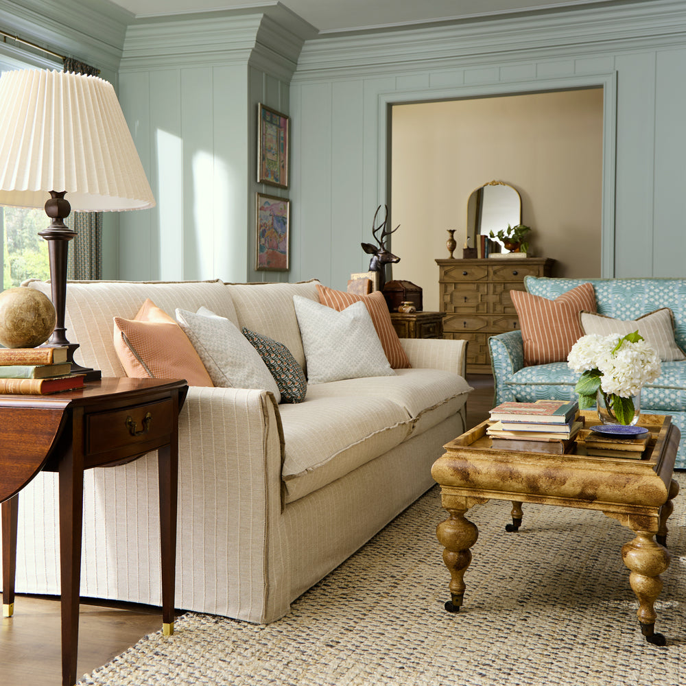 The collection features a variety of sofas, chairs, and accent pieces available in more than 80 exclusive fabrics. The line embodies Erin’s signature grand millennial style—a timeless yet current aesthetic that layers heritage patterns, cozy textures, nostalgic colors, and collected charm. Erin personally hand-painted one of the signature prints in the collection, infusing the line with her own artistry and storytelling. Additional fabrics include classic stripes, nostalgic florals, and heirloom-inspired prints that pair beautifully with the tailored silhouettes.