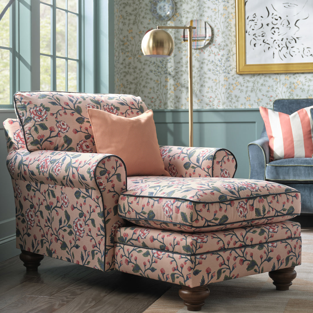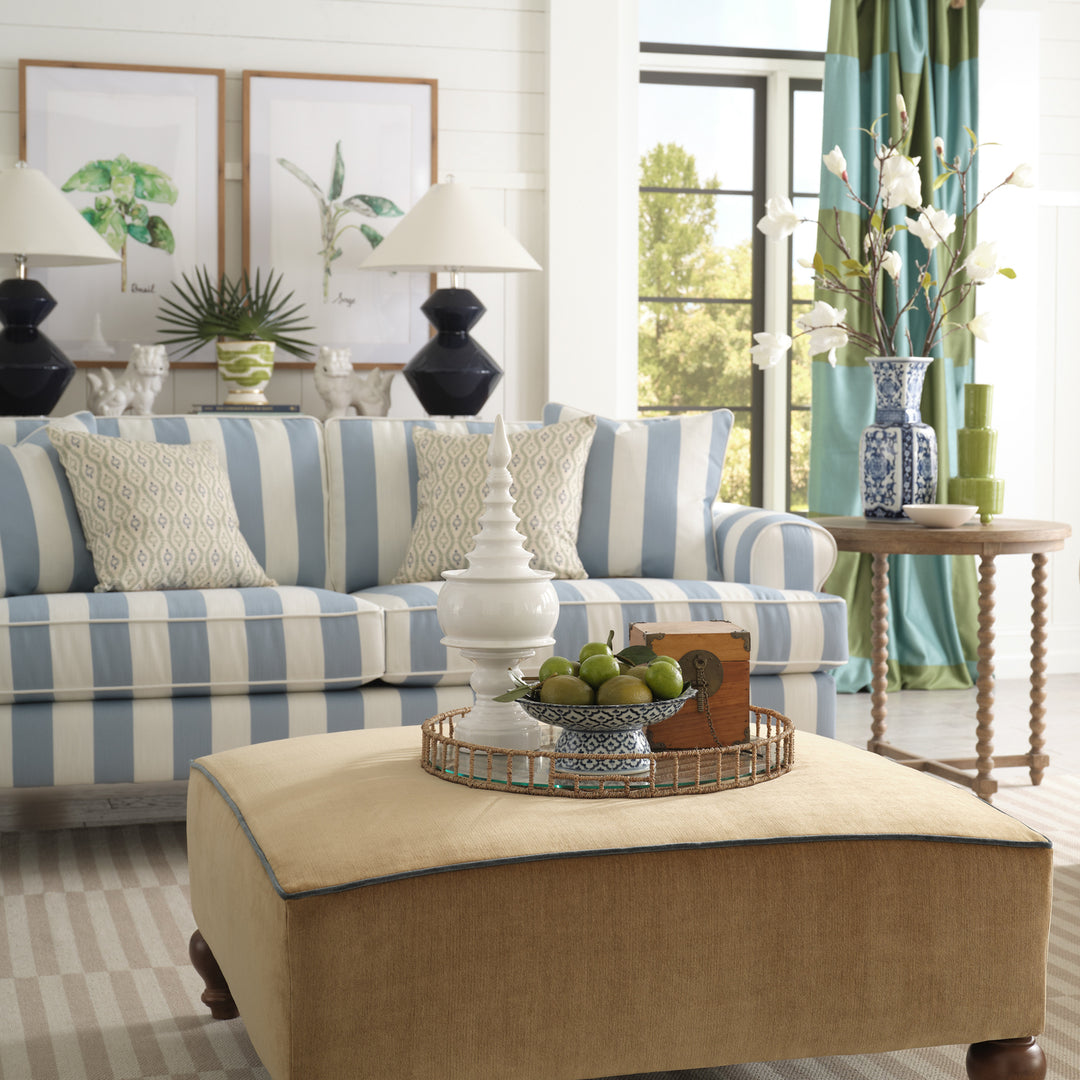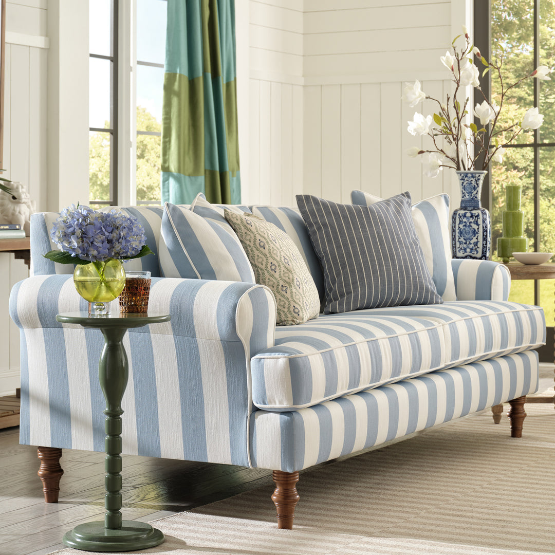 The collection features a variety of sofas, chairs, and accent pieces available in more than 80 exclusive fabrics. The line embodies Erin’s signature grand millennial style—a timeless yet current aesthetic that layers heritage patterns, cozy textures, nostalgic colors, and collected charm. Erin personally hand-painted one of the signature prints in the collection, infusing the line with her own artistry and storytelling. Additional fabrics include classic stripes, nostalgic florals, and heirloom-inspired prints that pair beautifully with the tailored silhouettes.