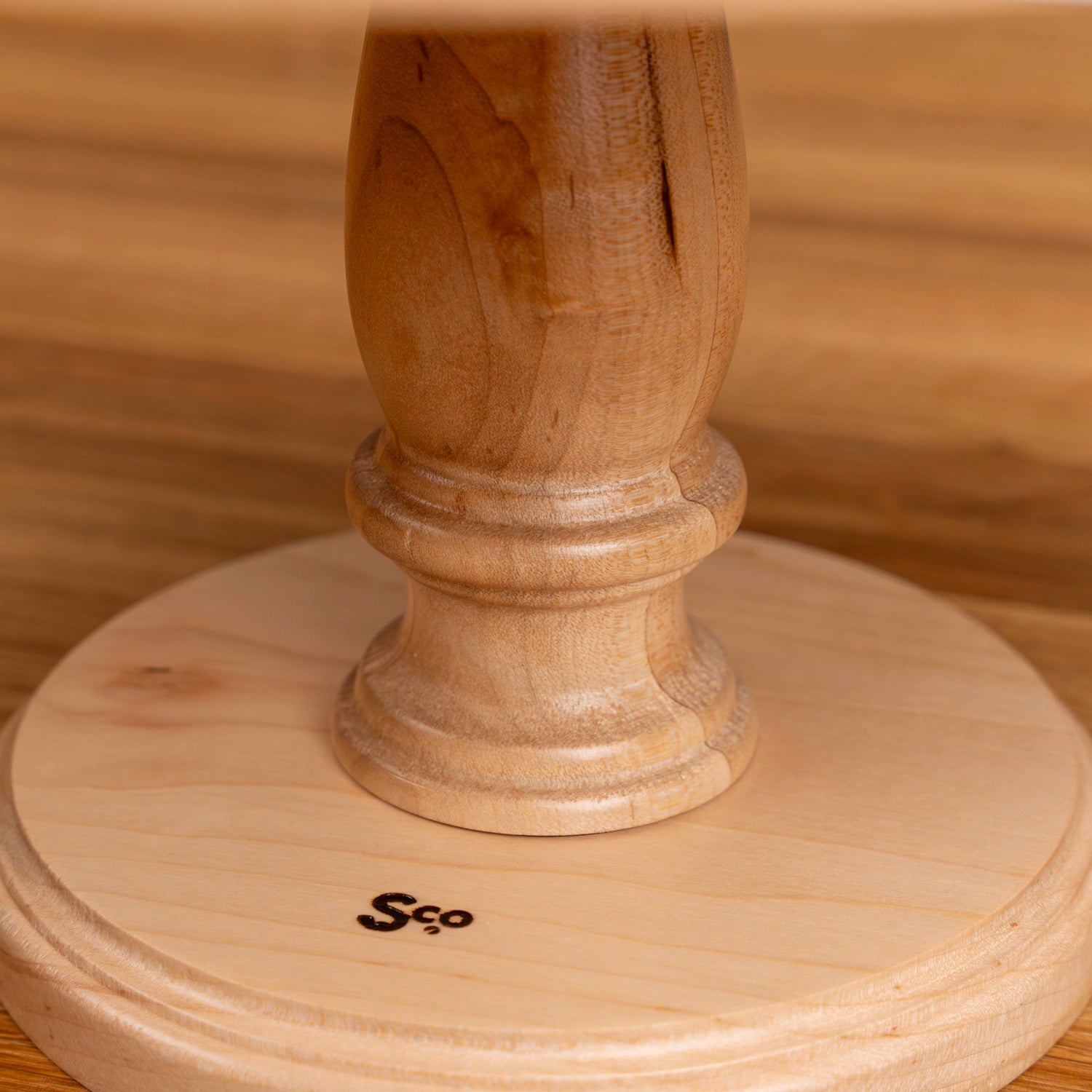 This Scotsman Co. Maple Cake Stand is an essential decorative piece in the kitchen. It will elevate any cake or dessert in your home with its gracefully turned pedestal. Finished with a polyurethane finish to further highlight the woods gorgeous grain.