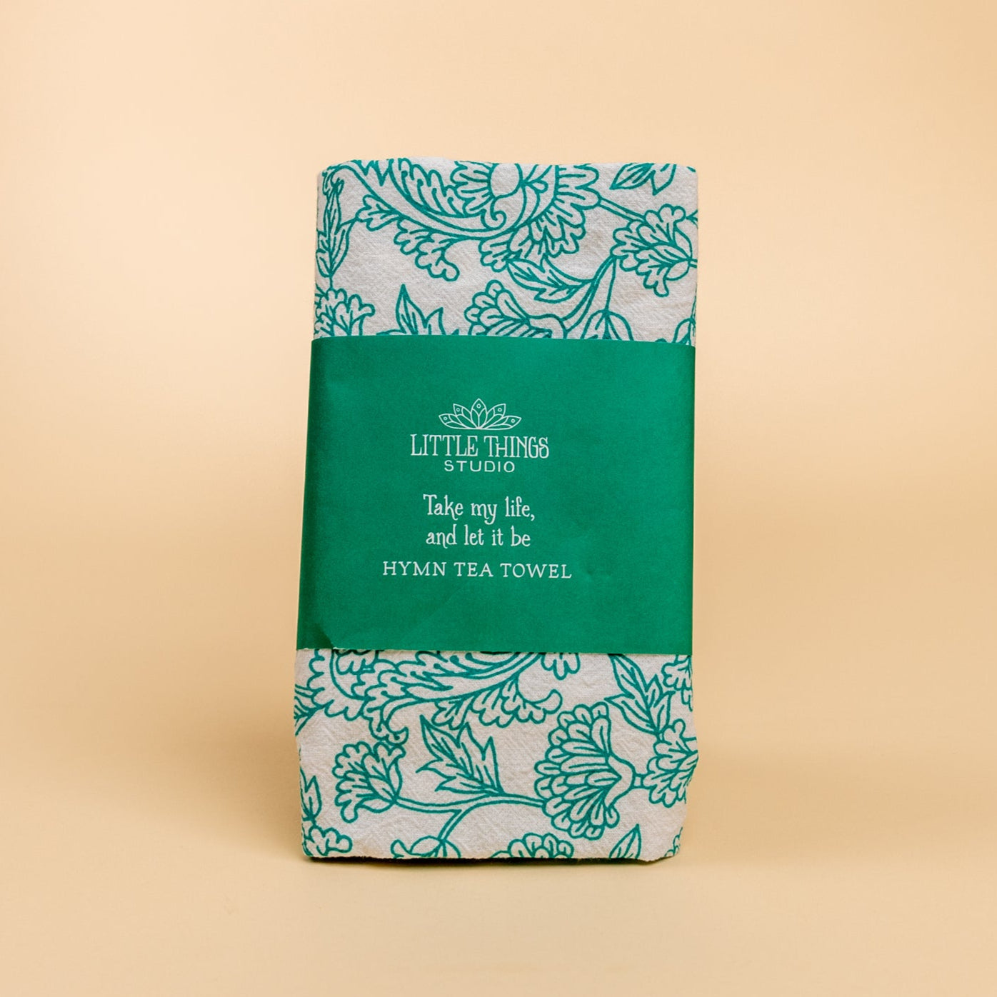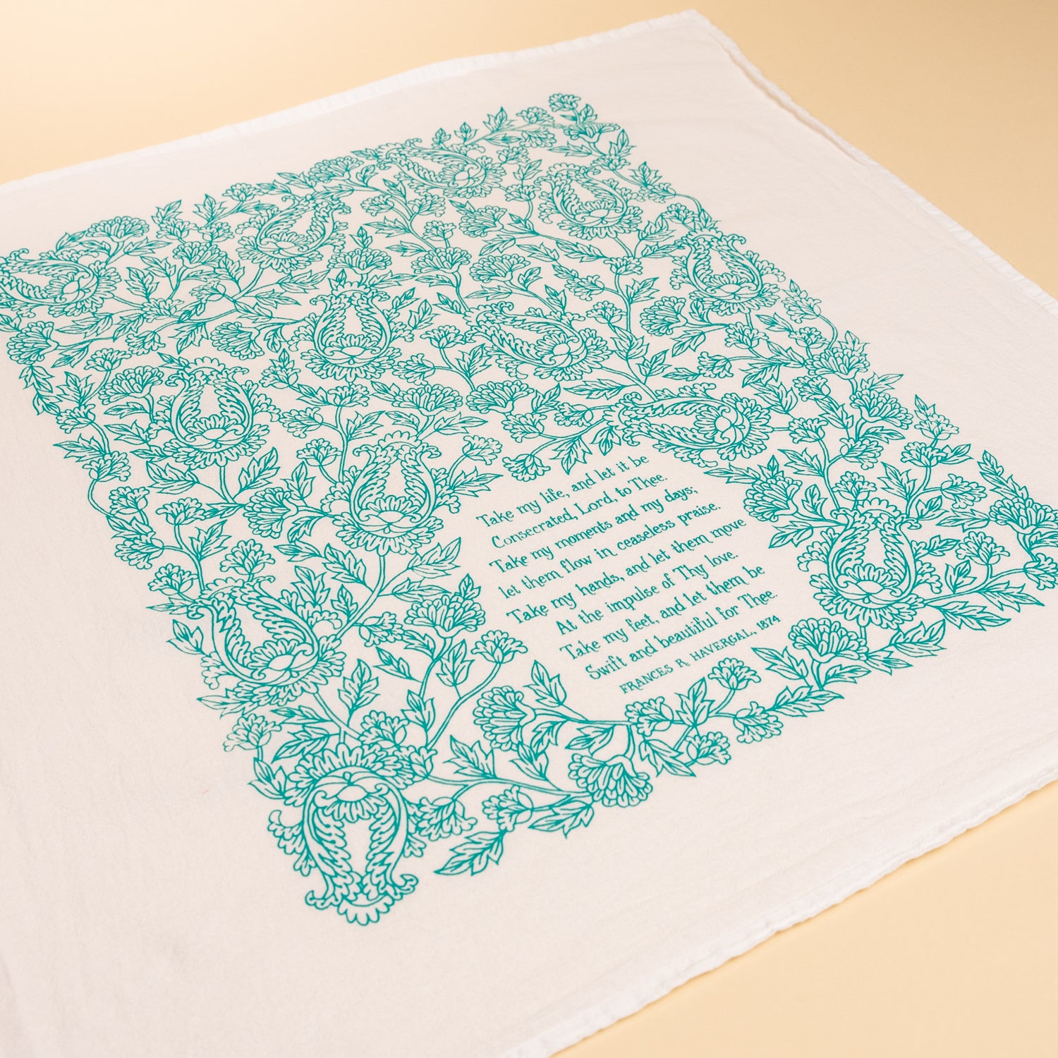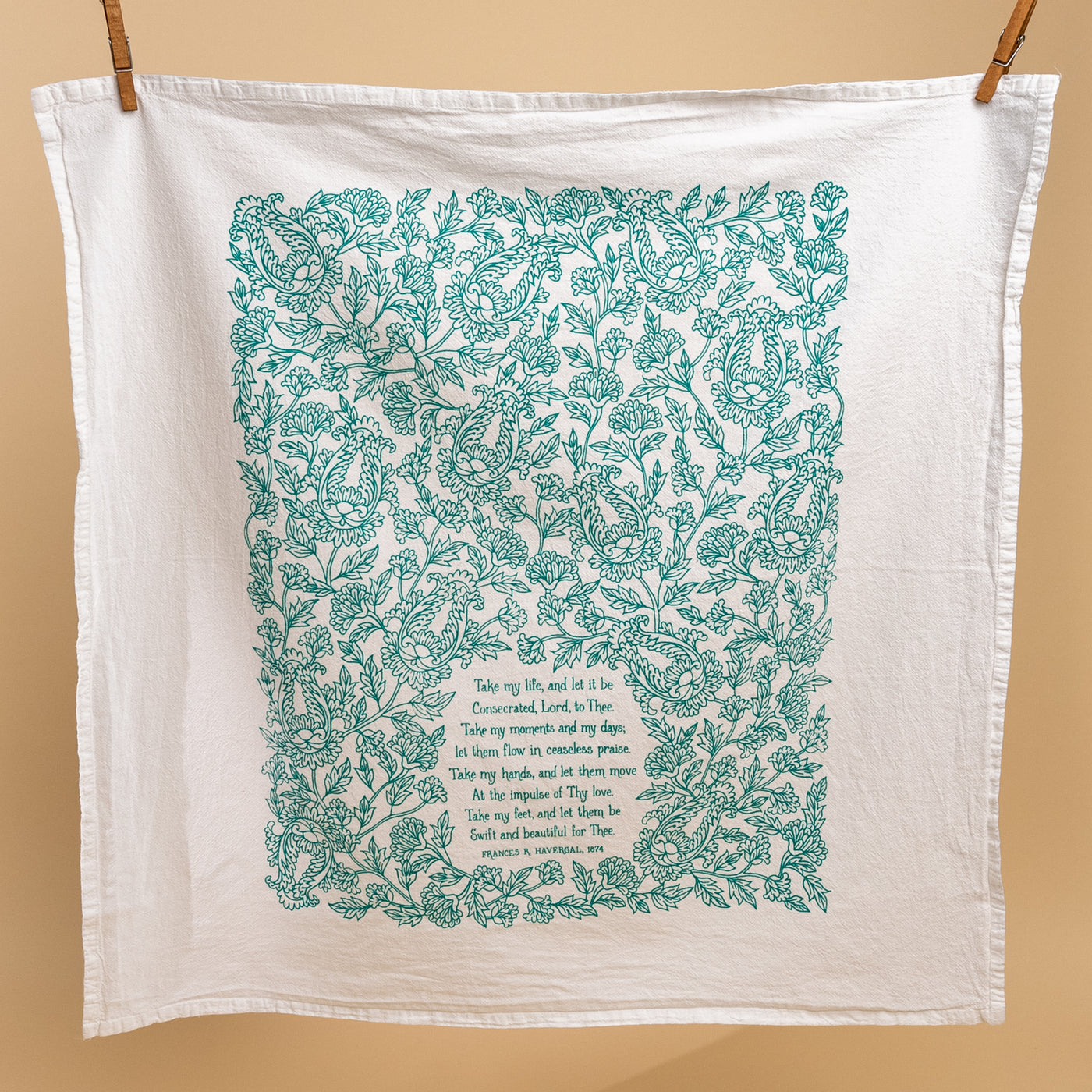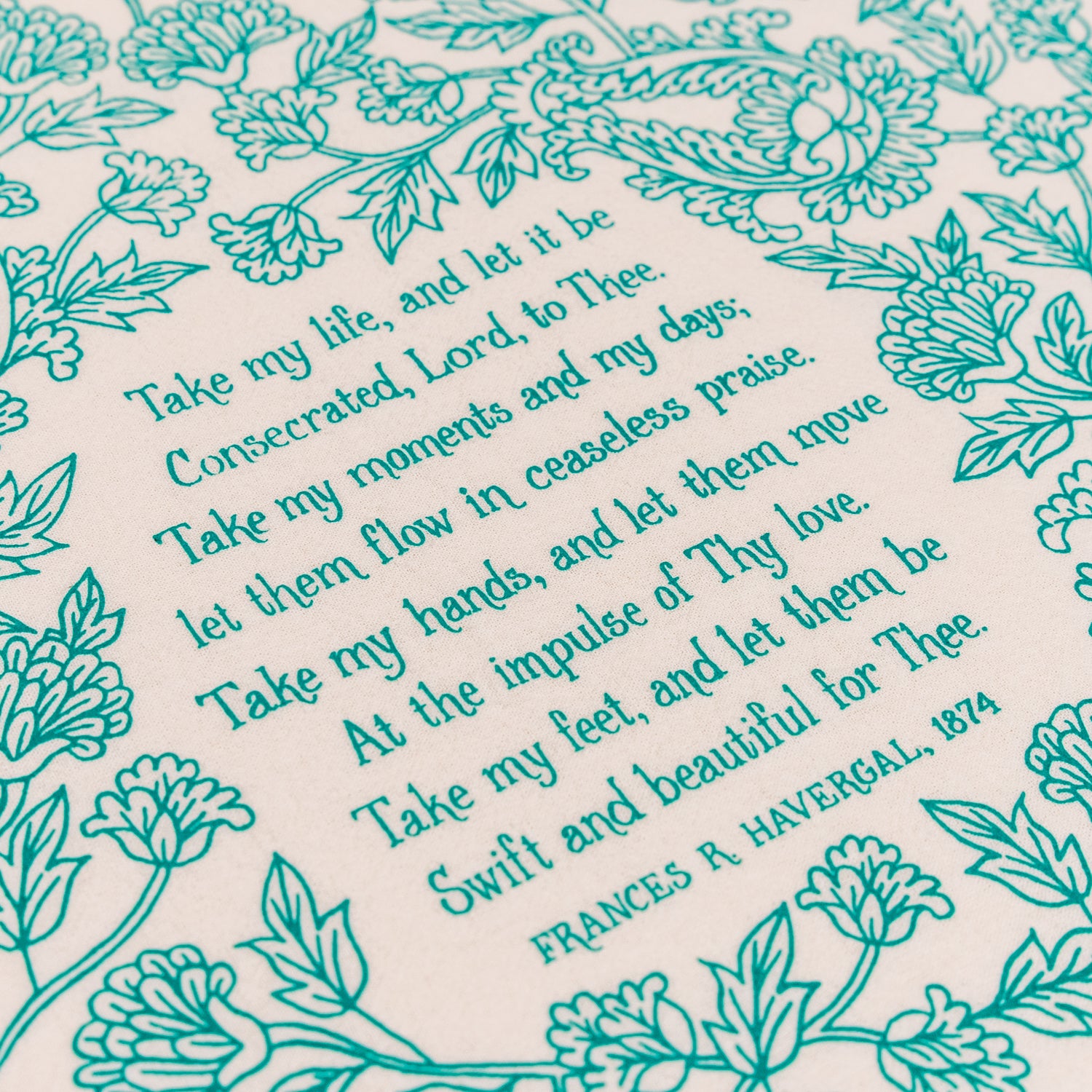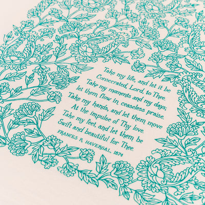 "Take My Life and Let It Be" with floral design printed in aqua green