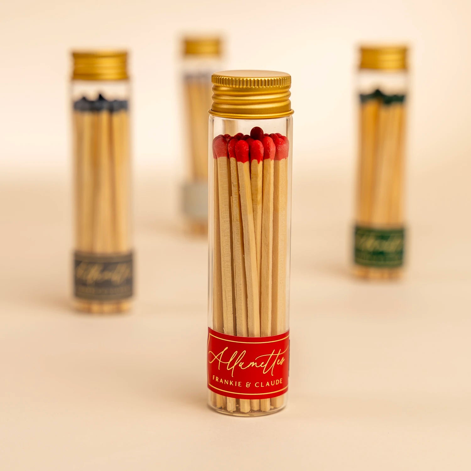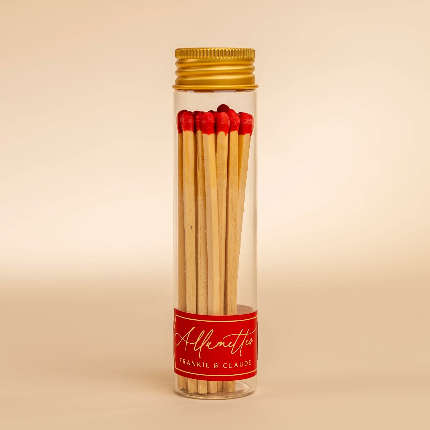 Our tall glass match jar with red 4" matches and a gold lid brings bold color and function to any decor in your home. The vibrant hue plus the 4" matches offer both practicality and style.