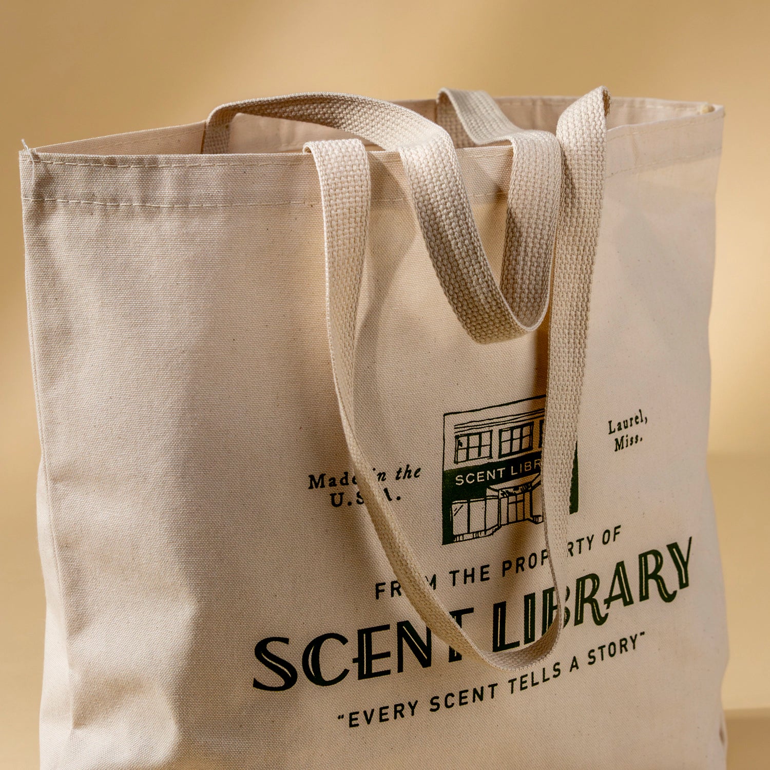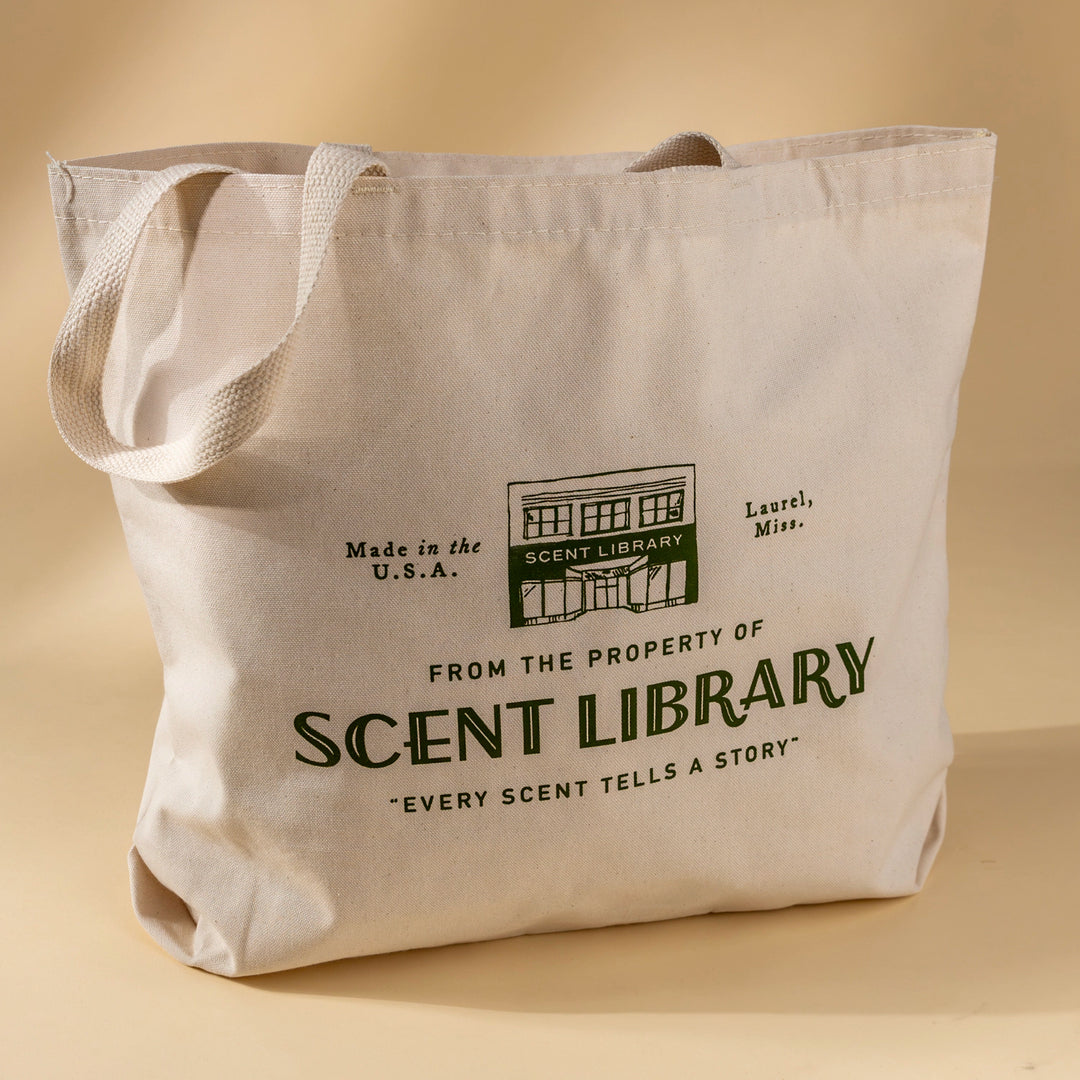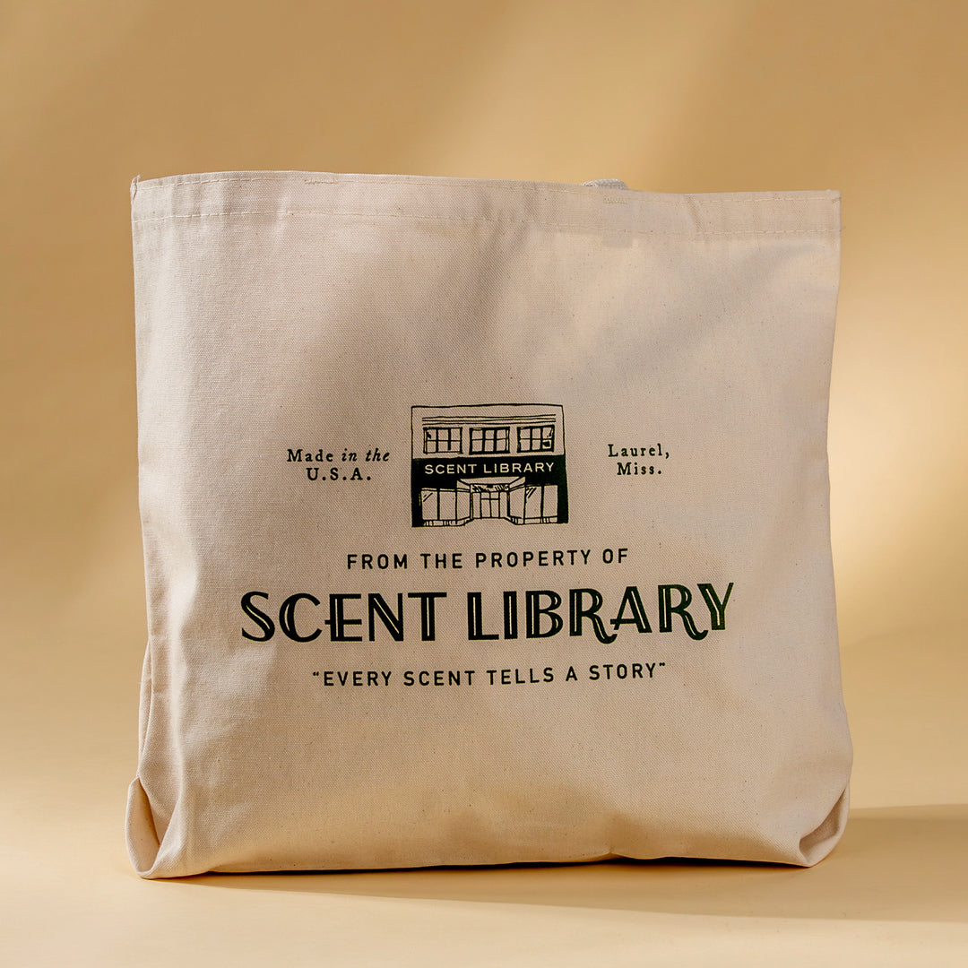 A 100% cotton canvas tote with the Scent Library store front screen printed. These totes are perfect for a beach trip, a catch-all for the kids or shopping!
