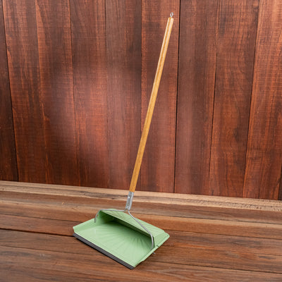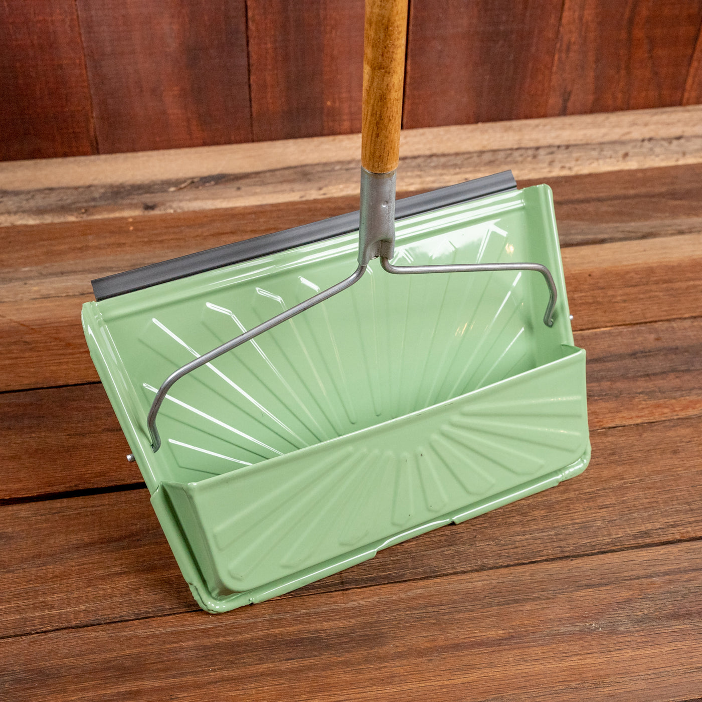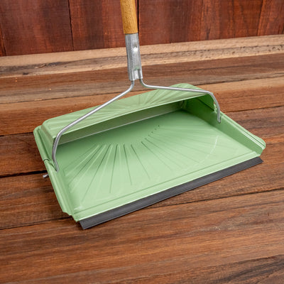 This vintage inspired dustpan comes with a 30" tall wooden handle for easy clean-up and an eyelet hook for easy hanging. This dustpan has a baked enamel finish is made of steel.