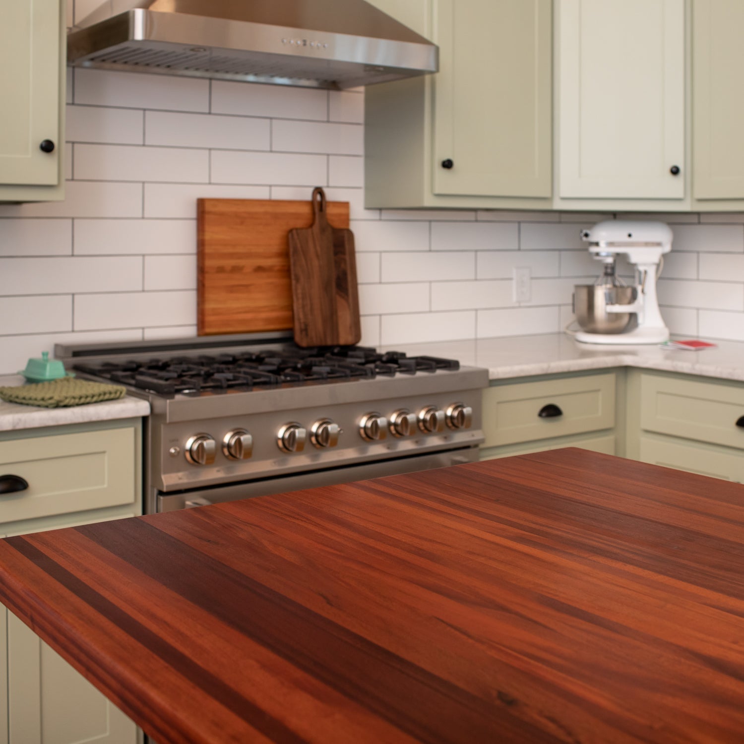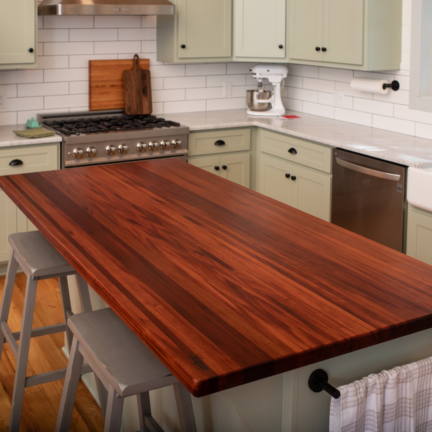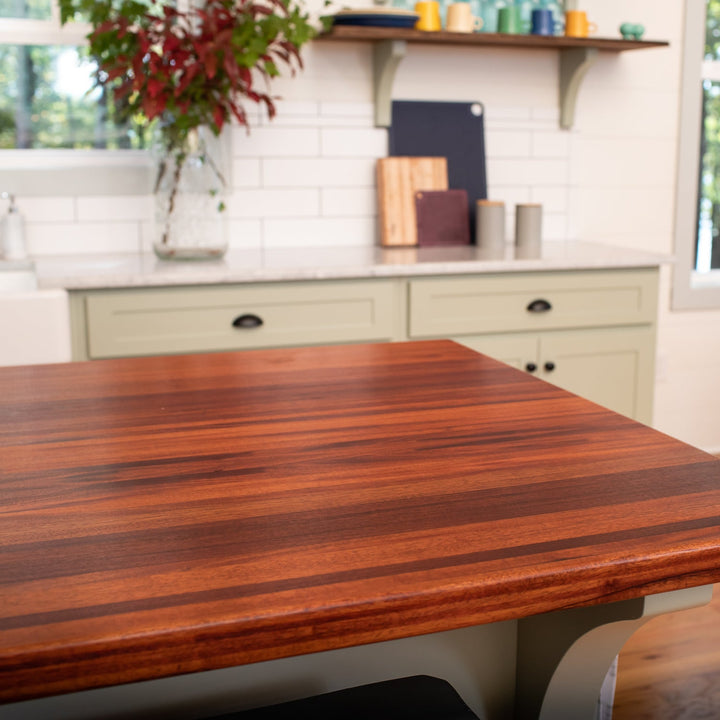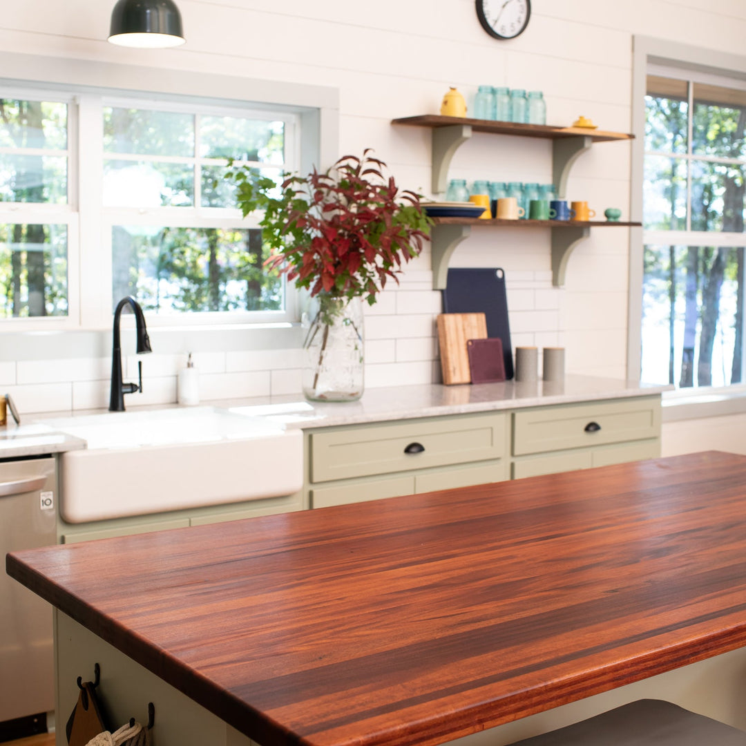 Pro tip: An oil finish means the wood grain is more exposed to nicks and scratches, but this allows for easy repair sanding and quick touch-ups. Great for heavy-use islands where the marks of use lend to the warmth of the home like historic butcher blocks.