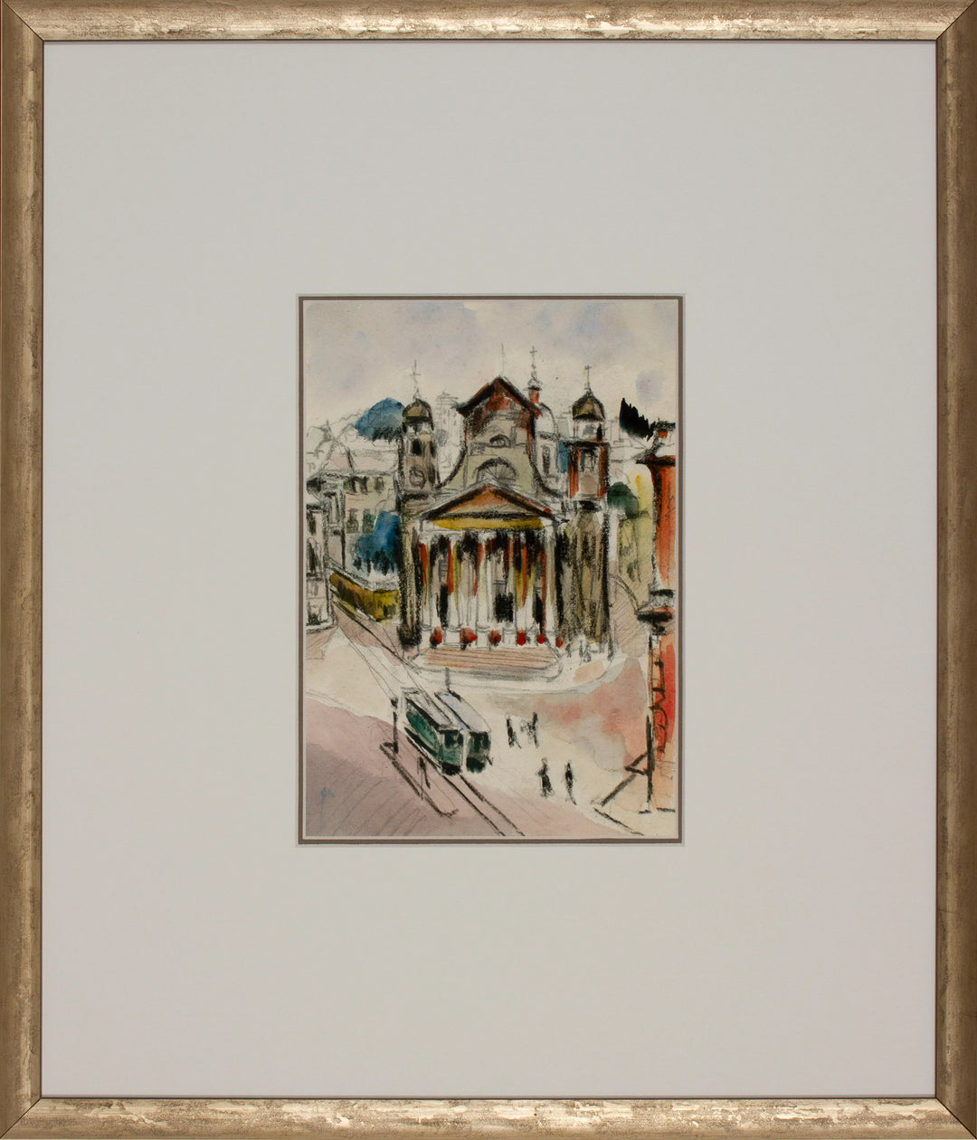 This giclee print is a great exclusive piece showing great architecture of cityscapes. It has a torn edge, floated on a mat board, and framed with a moon gold frame.