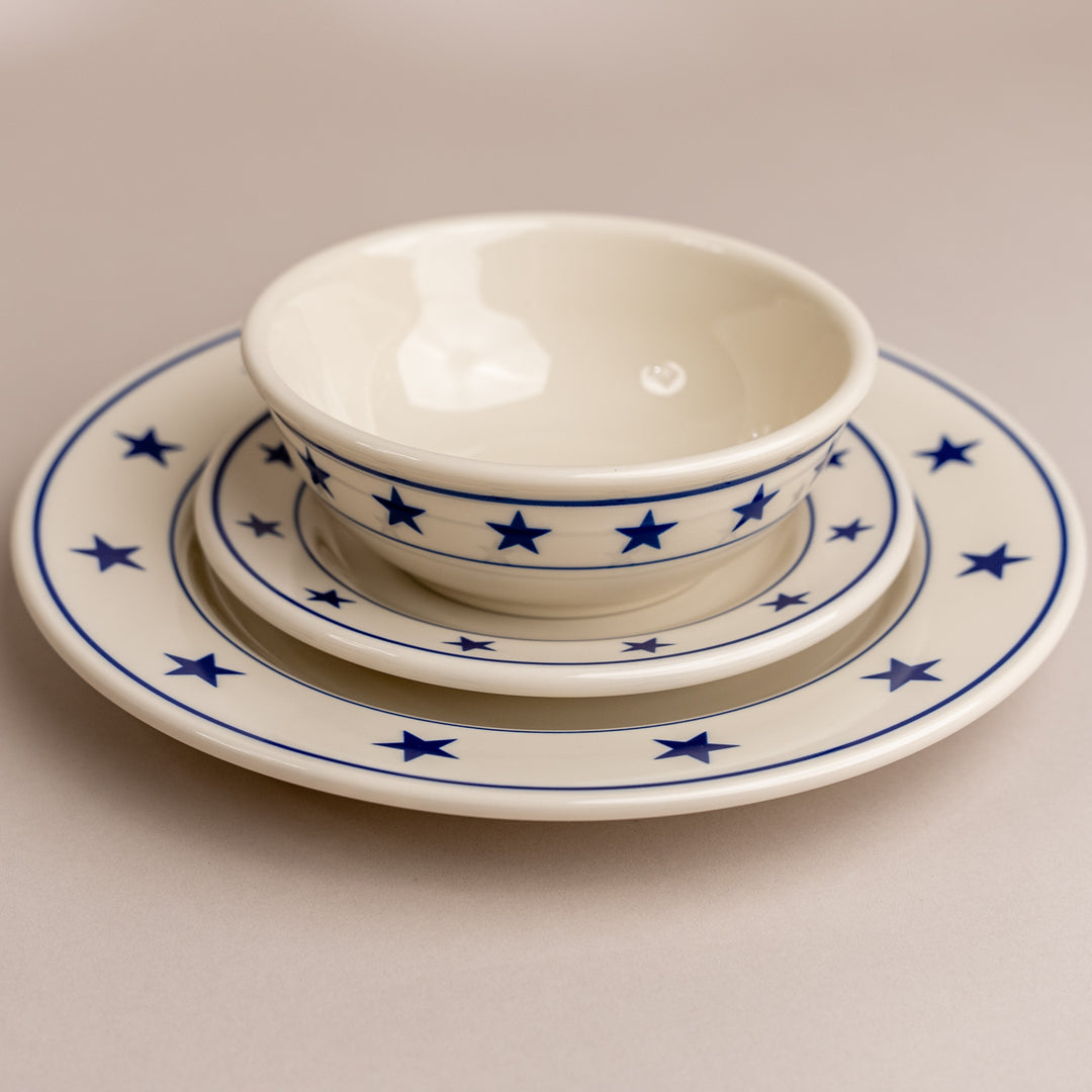 This Americana design is classic and timeless. The design is truly versatile and the perfect addition to any tabletop for years to come. Its durable ivory finish and blue star design compliments a wide range of styles, especially our Marisol and Carolyn styles. Made in the U.S.A. by the same company that's been bringing these classic, quality pieces to diners and homes for over 150 years!