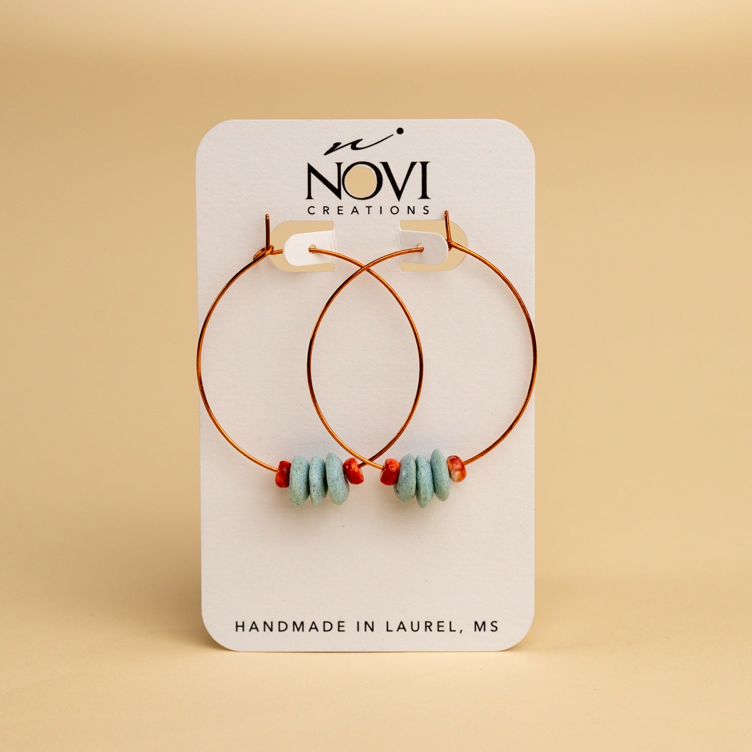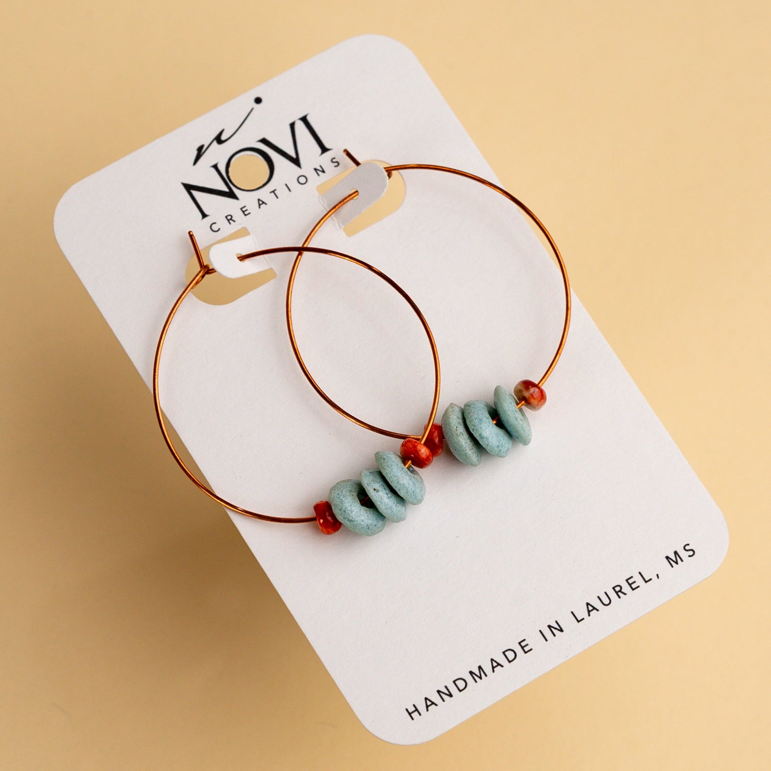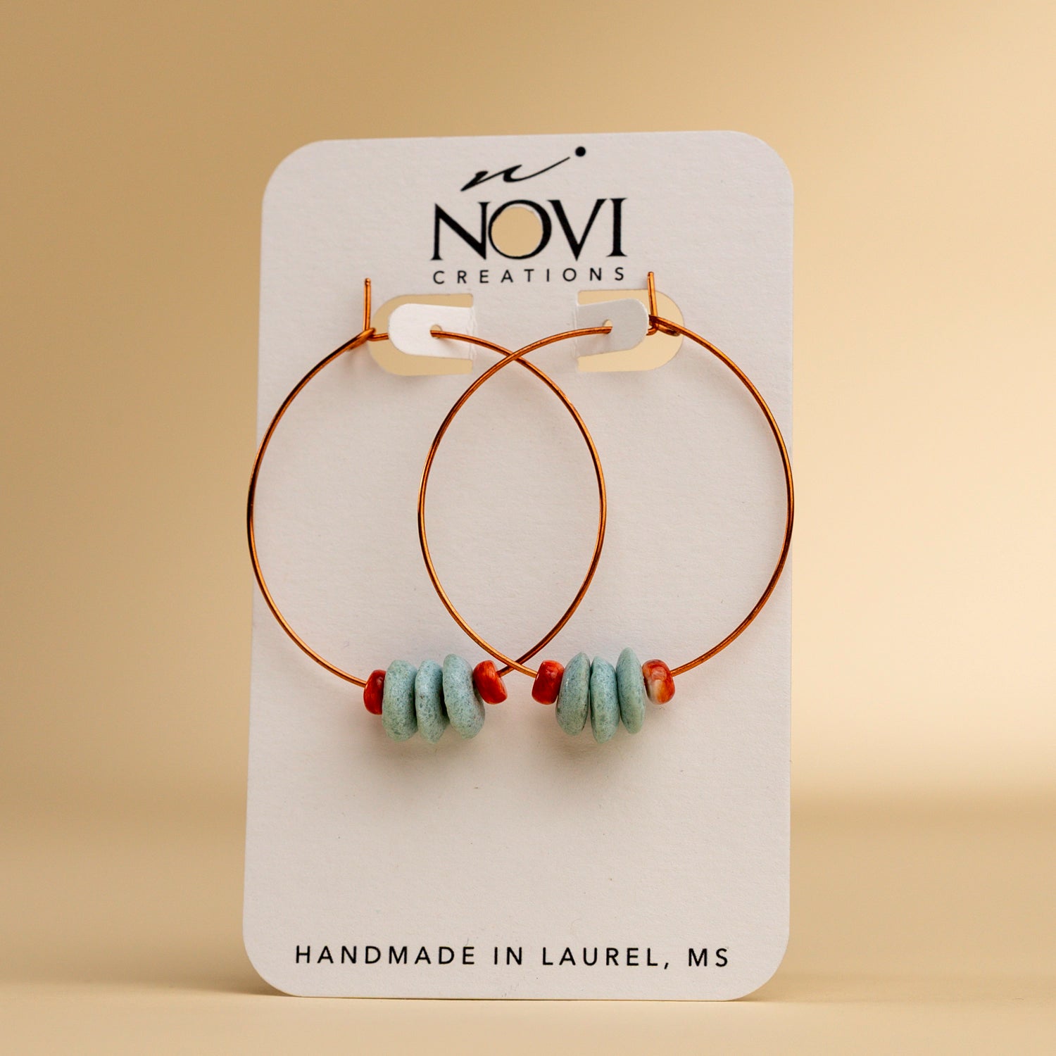 These pure copper earrings are super fun and stylish while also being incredibly lightweight. Hand formed copper wire, salvaged water buffalo horn, threader style hoops. Each hoop is made by hand and may vary slightly both in stone selection and size of hoop, but are all 2” or slightly smaller. The water buffalo horn has a charcoal grey color with a matte finish that will slightly darken with age.