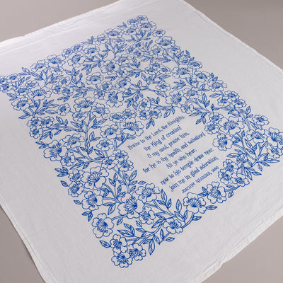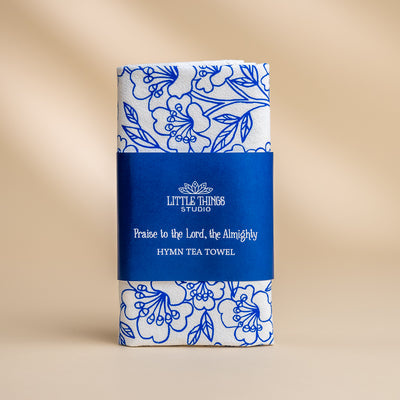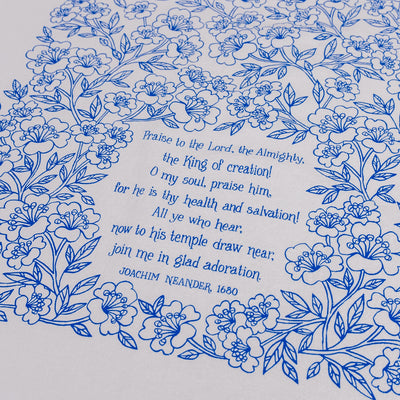 "Praise to The Lord, The Almighty" with floral design printed in blueberry